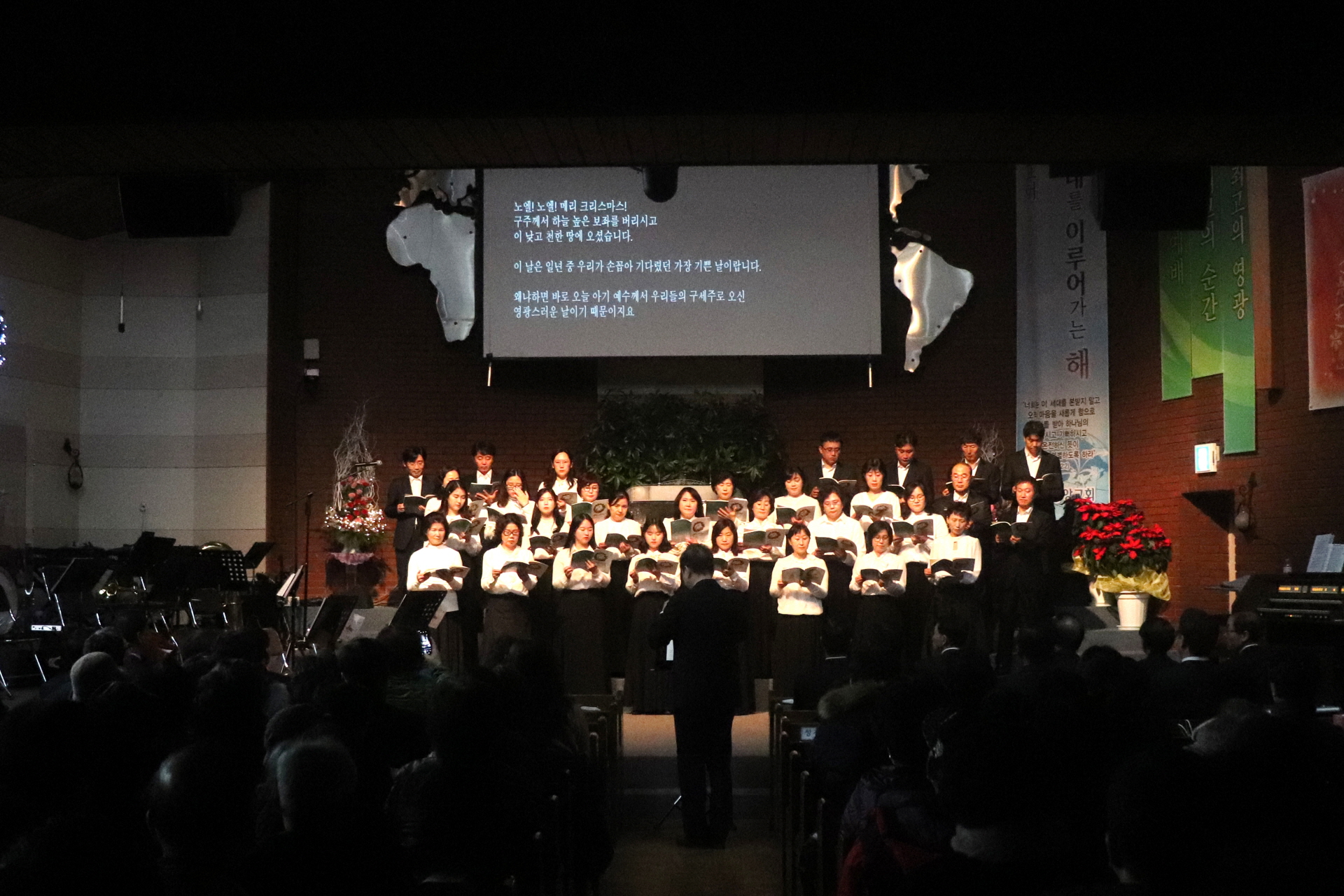 12월 25일 11시 본당에서 주일학교와 장년 연합으로 성탄감사예배를 드렸습니다. 특별히 할렐루야 성가대에서 준비한 「크리스마스 칸타타」가 있었습니다. 수고에 감사드립니다.