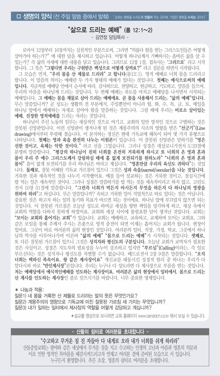 | 이전글 | 12월 08일 교회주보 | 운영자 | 2019.12.07 | 0 | 879 |