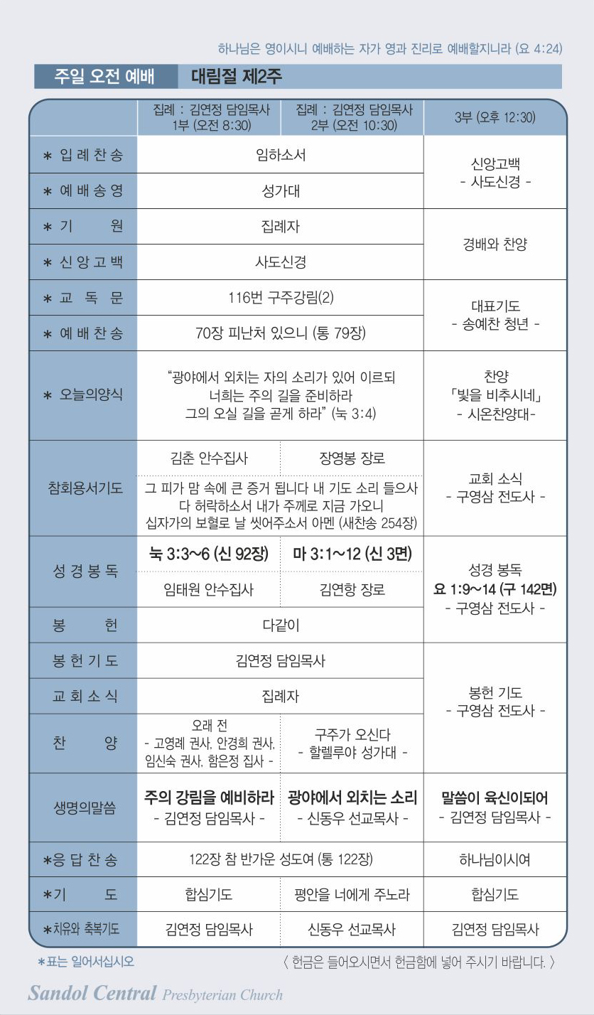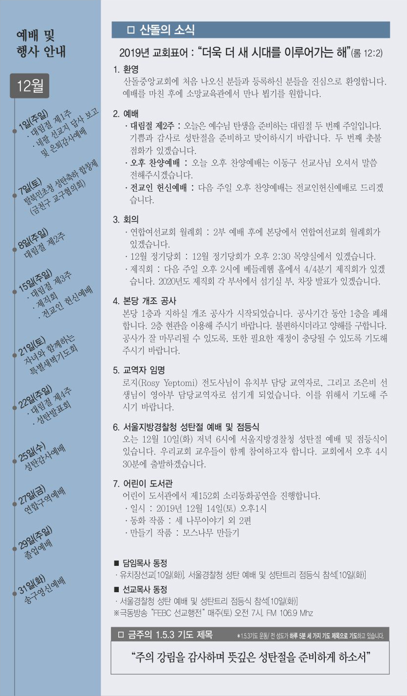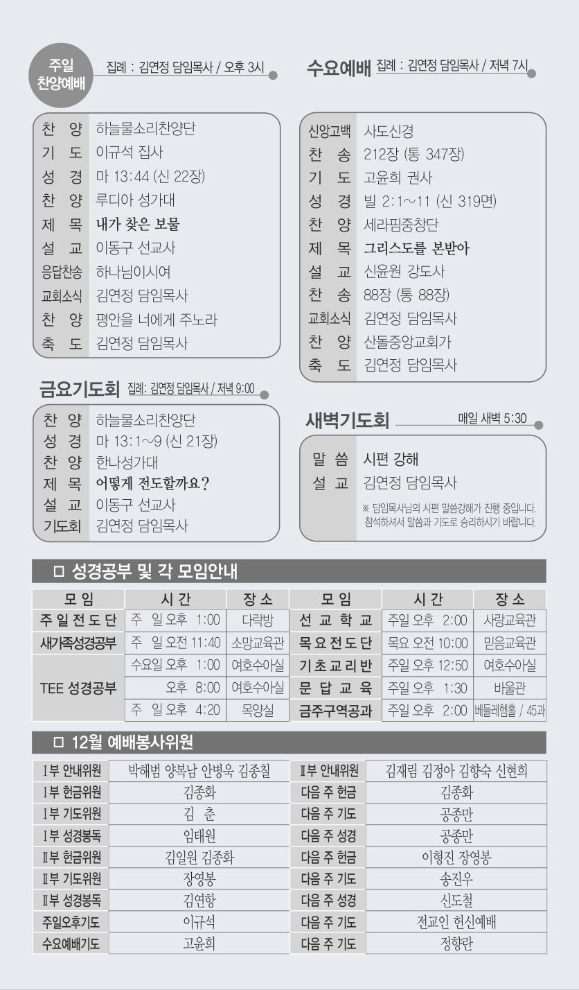 | 이전글 | 12월 15일 교회주보 | 운영자 | 2019.12.14 | 0 | 1050 |