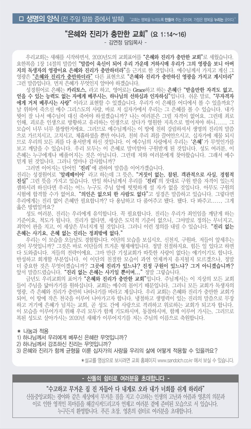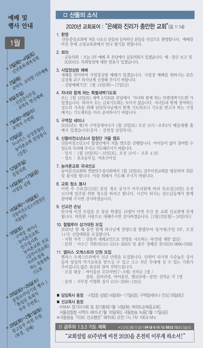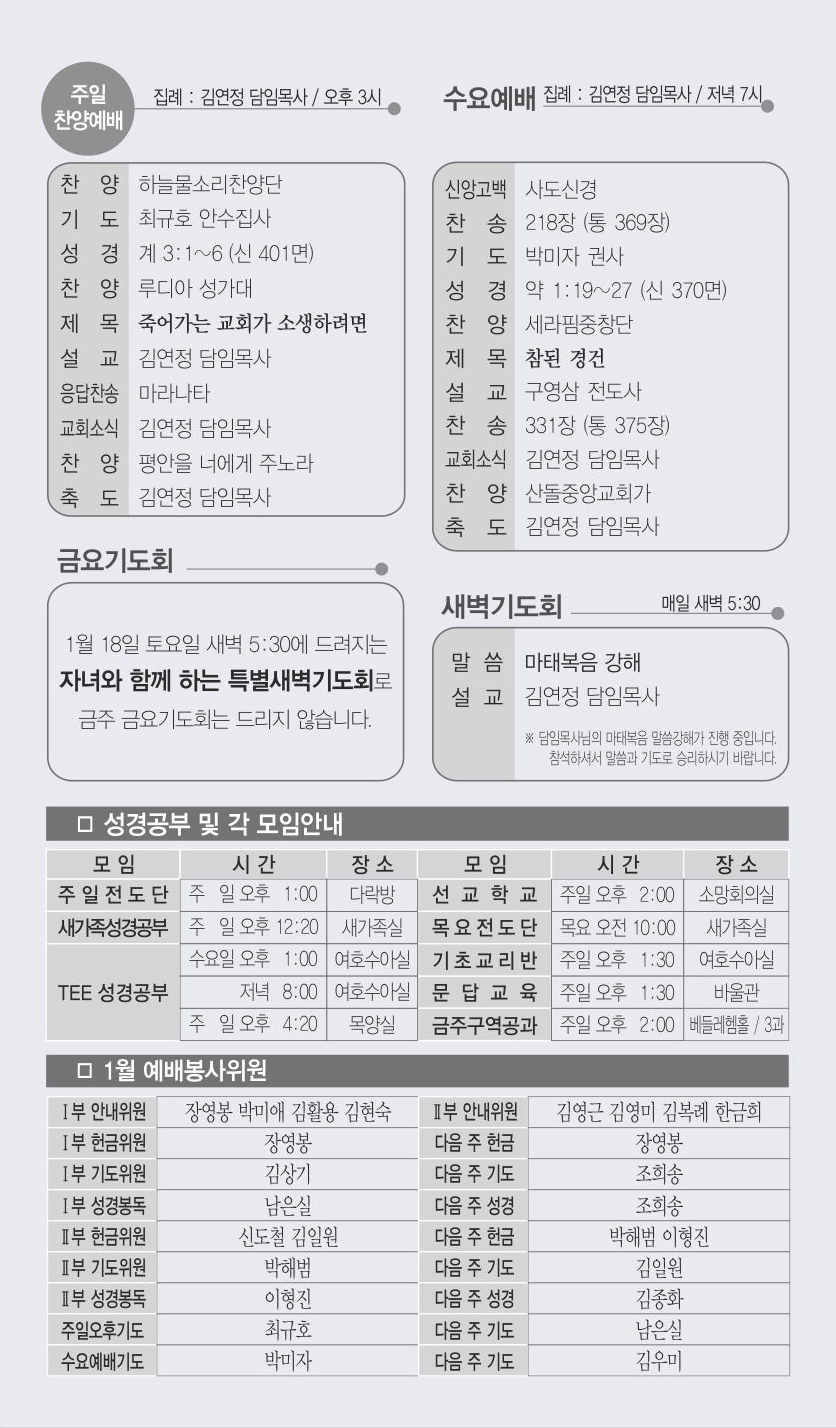 | 다음글 | 2020년 01월 05일 교회주보 | 운영자 | 2020.01.04 | 0 | 908 |