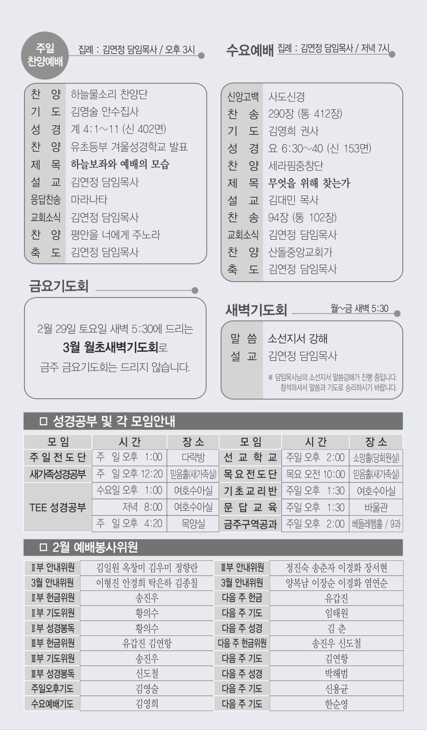 | 이전글 | 03월 01일 교회주보 | 운영자 | 2020.02.29 | 0 | 1070 |