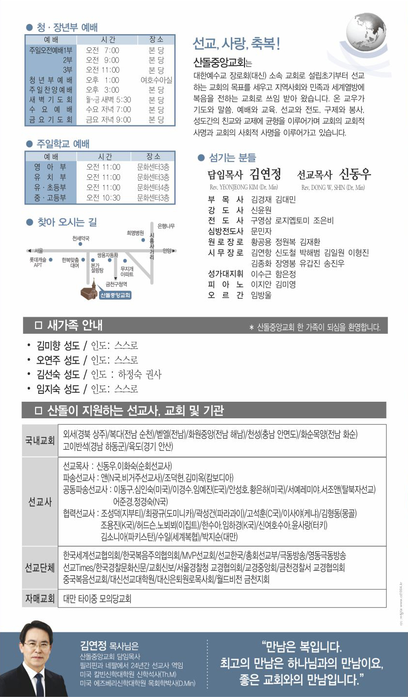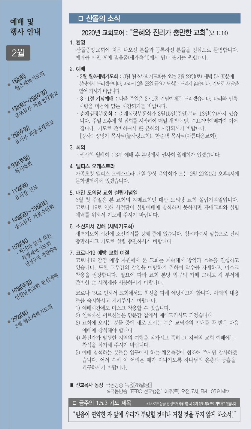 | 다음글 | 02월 16일 교회주보 | 운영자 | 2020.02.14 | 0 | 971 |