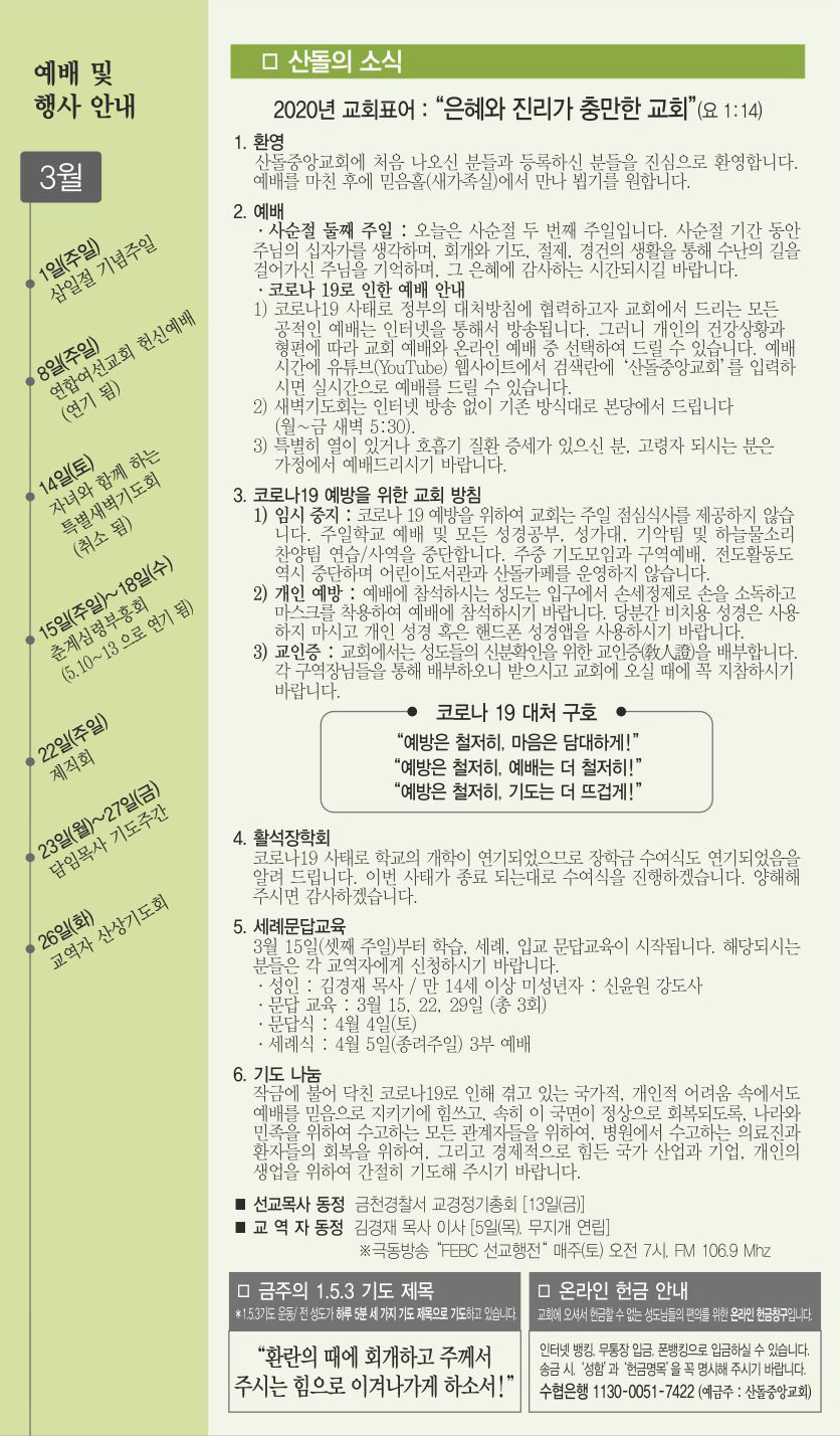 | 다음글 | 03월 01일 교회주보 | 운영자 | 2020.02.29 | 0 | 1069 |