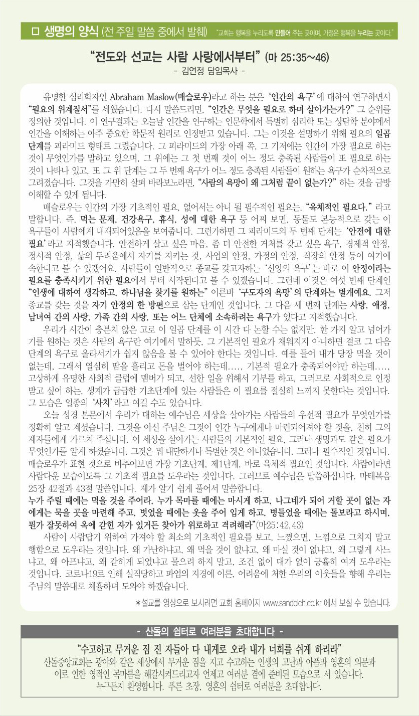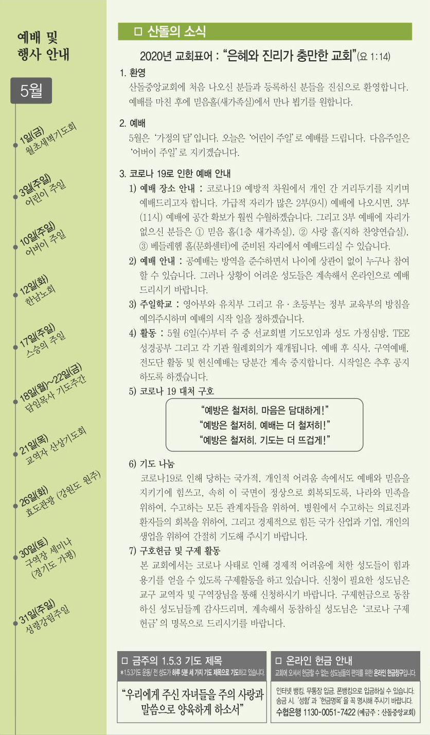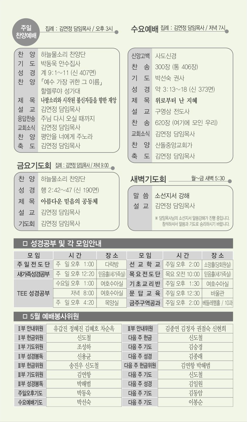 | 이전글 | 05월 10일 교회주보 | 운영자 | 2020.05.08 | 0 | 867 |
