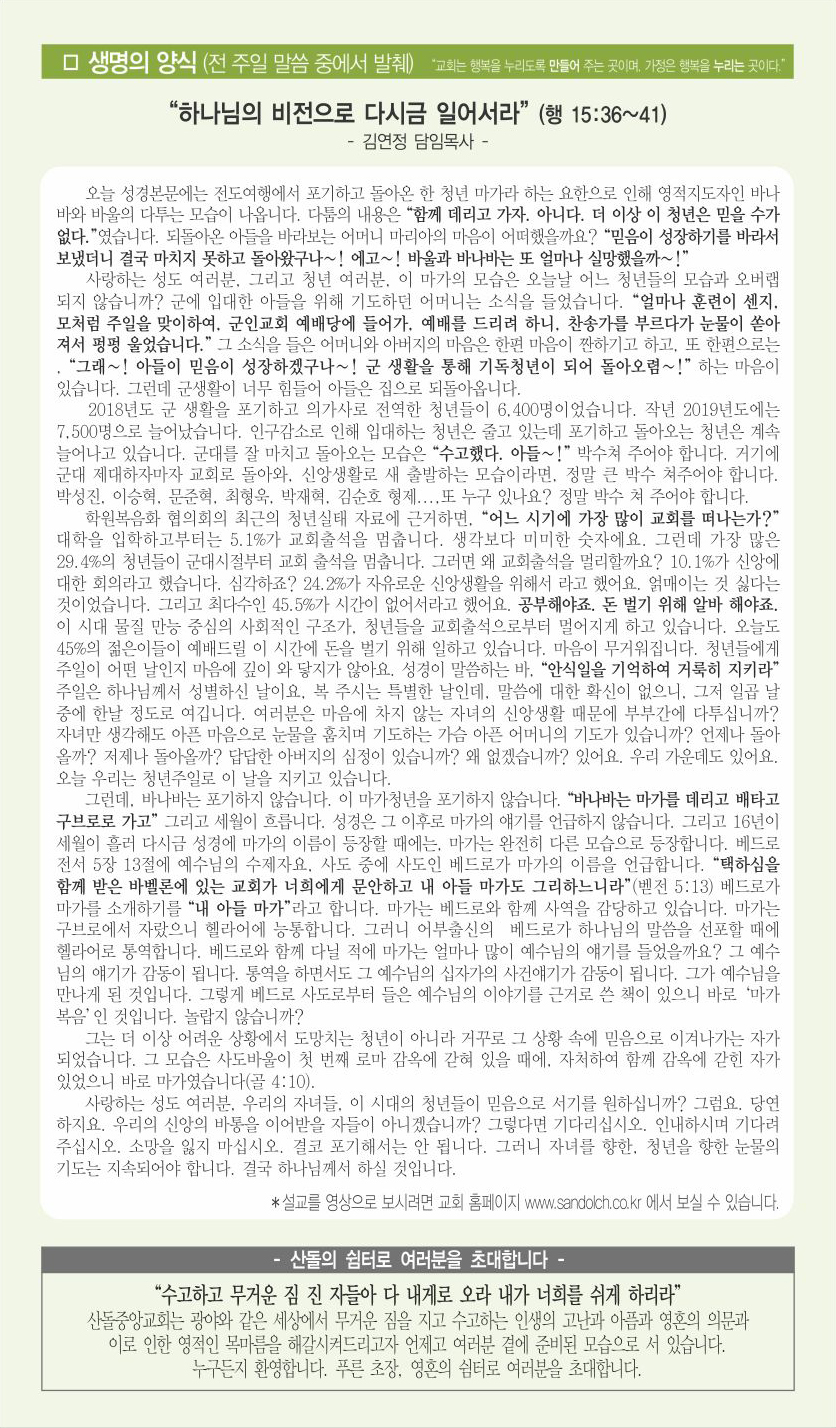 | 다음글 | 05월 17일 교회주보 | 운영자 | 2020.05.15 | 0 | 931 |