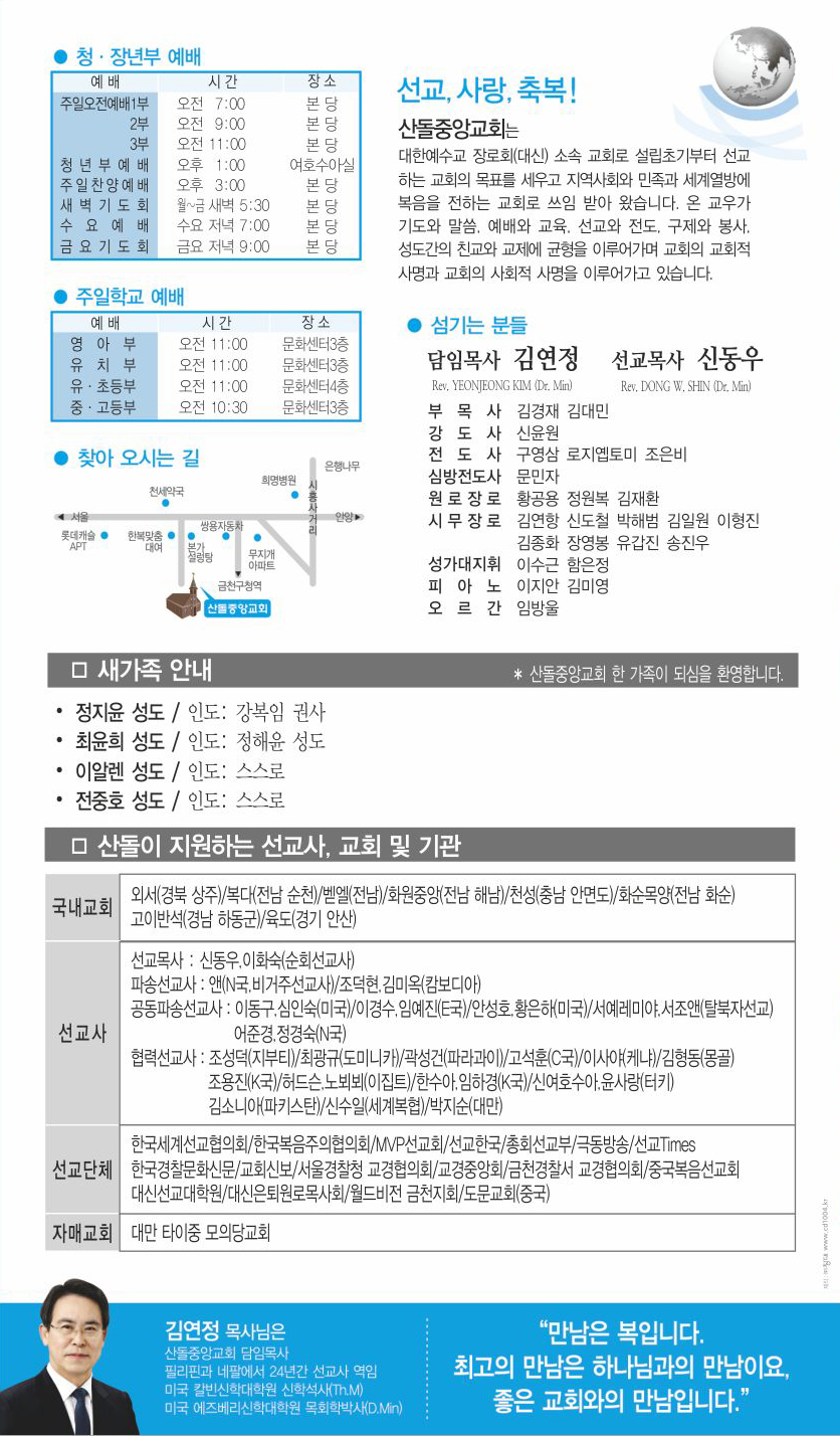 | 다음글 | 07월 12일 교회주보 | 운영자 | 2020.07.11 | 0 | 1380 |