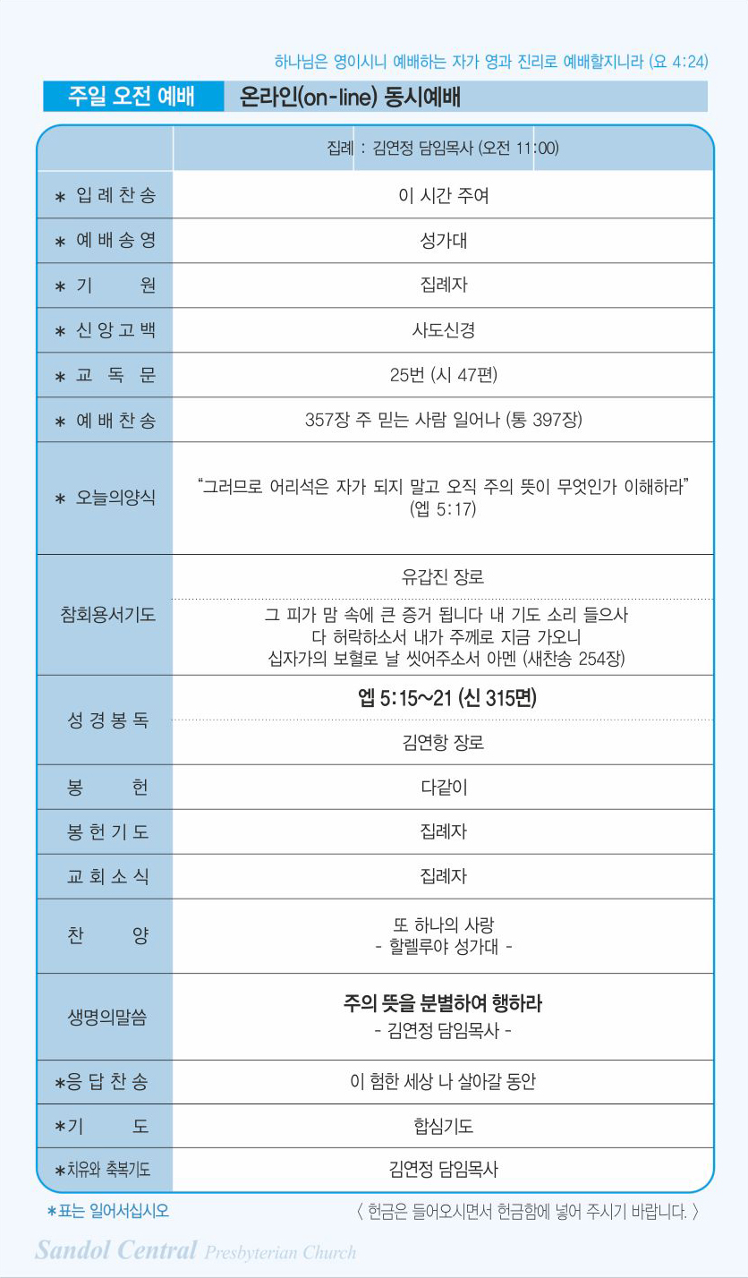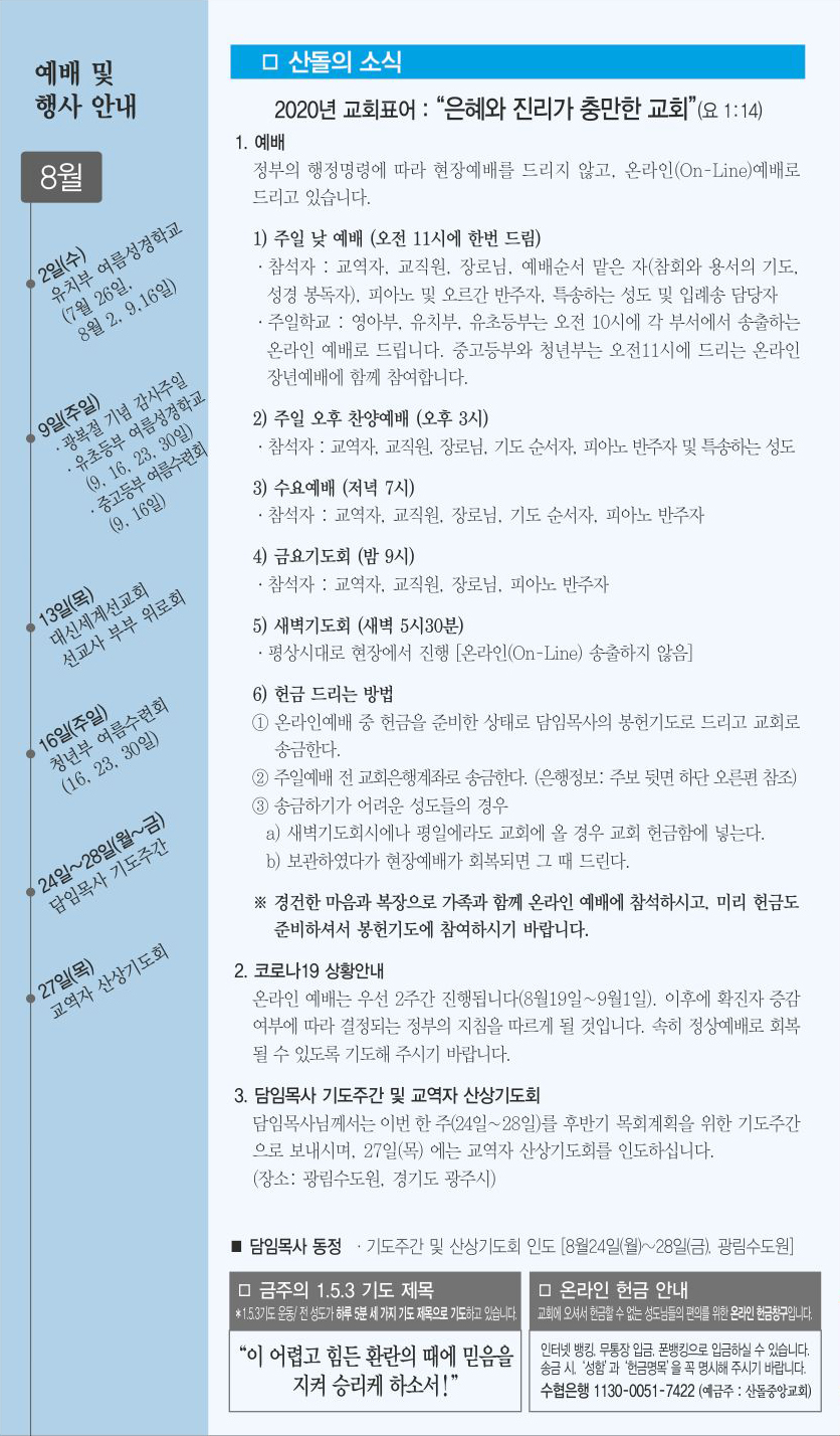 | 다음글 | 08월 16일 교회주보 | 운영자 | 2020.08.15 | 0 | 862 |