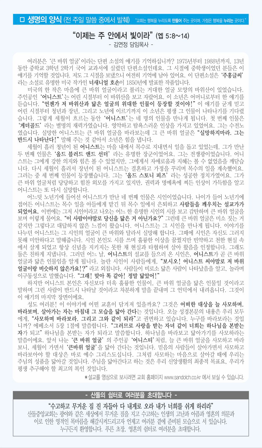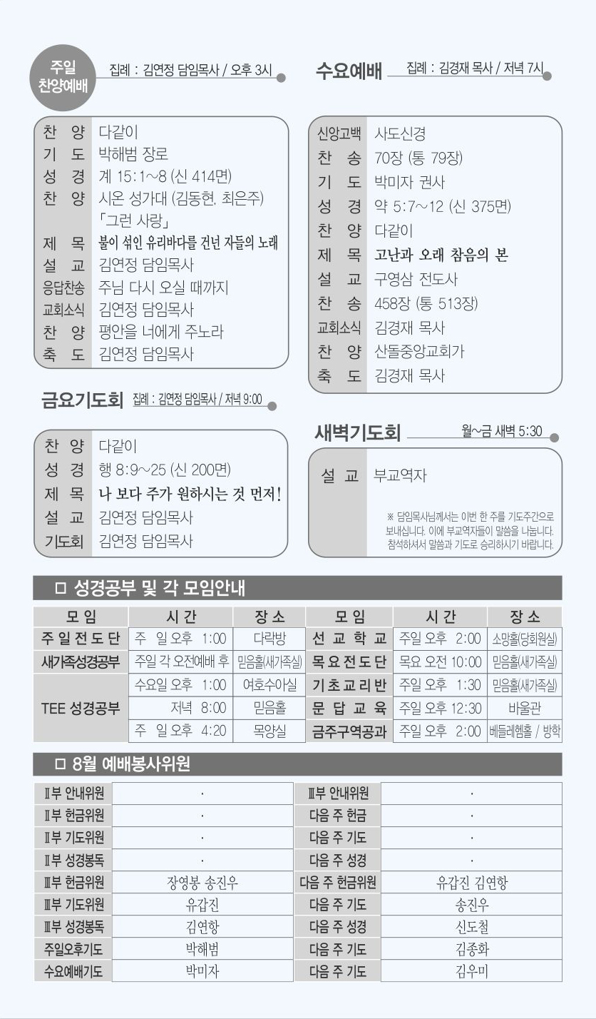 | 이전글 | 08월 30일 교회주보 | 운영자 | 2020.08.29 | 0 | 840 |