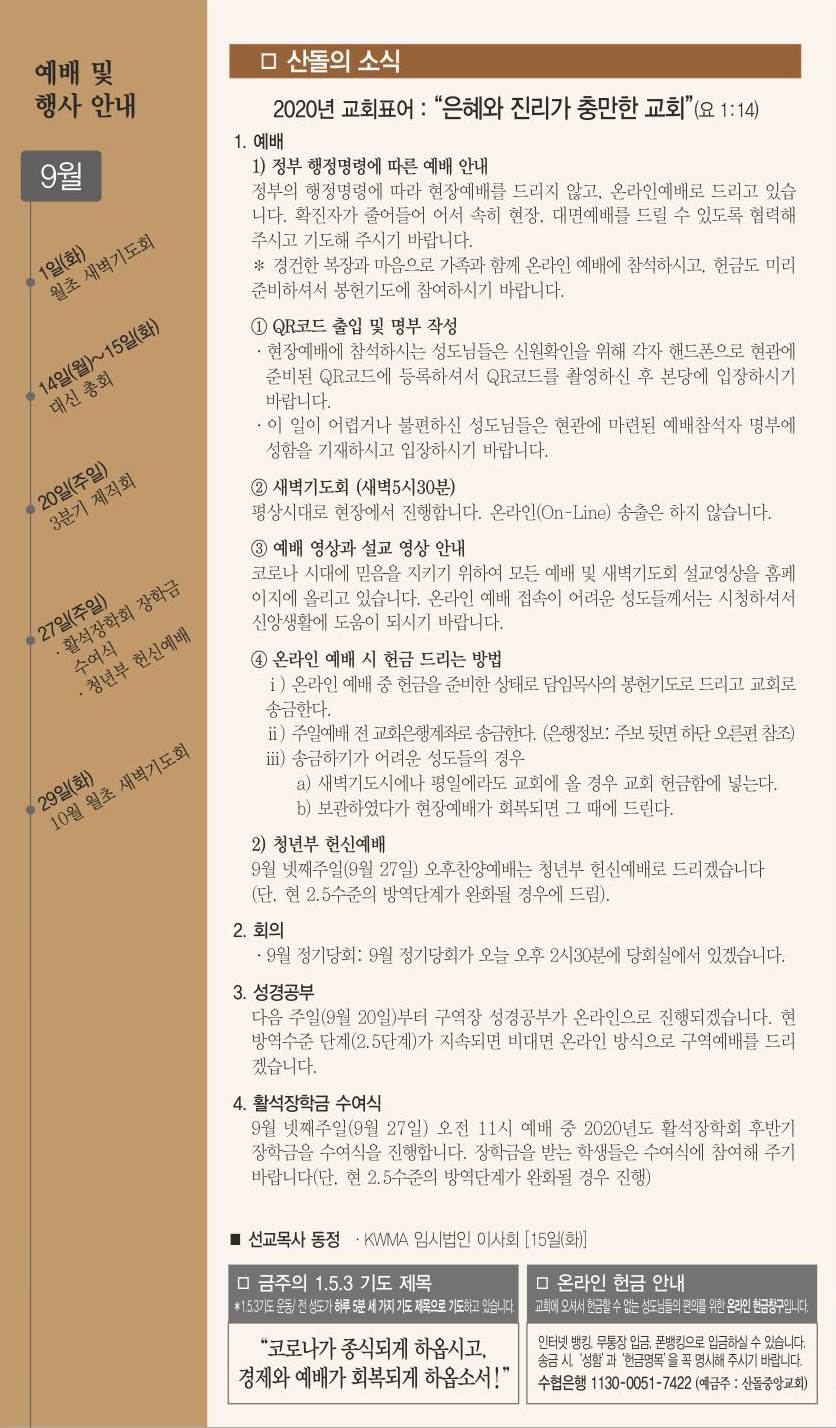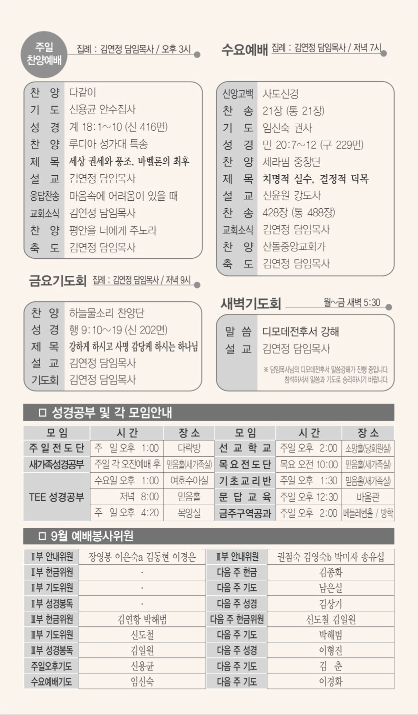 | 이전글 | 09월 19일 교회주보 | 운영자 | 2020.09.19 | 0 | 977 |