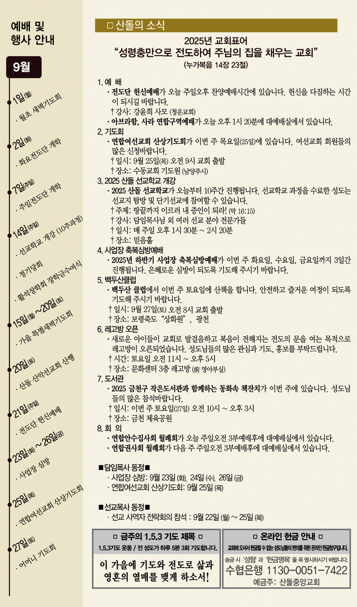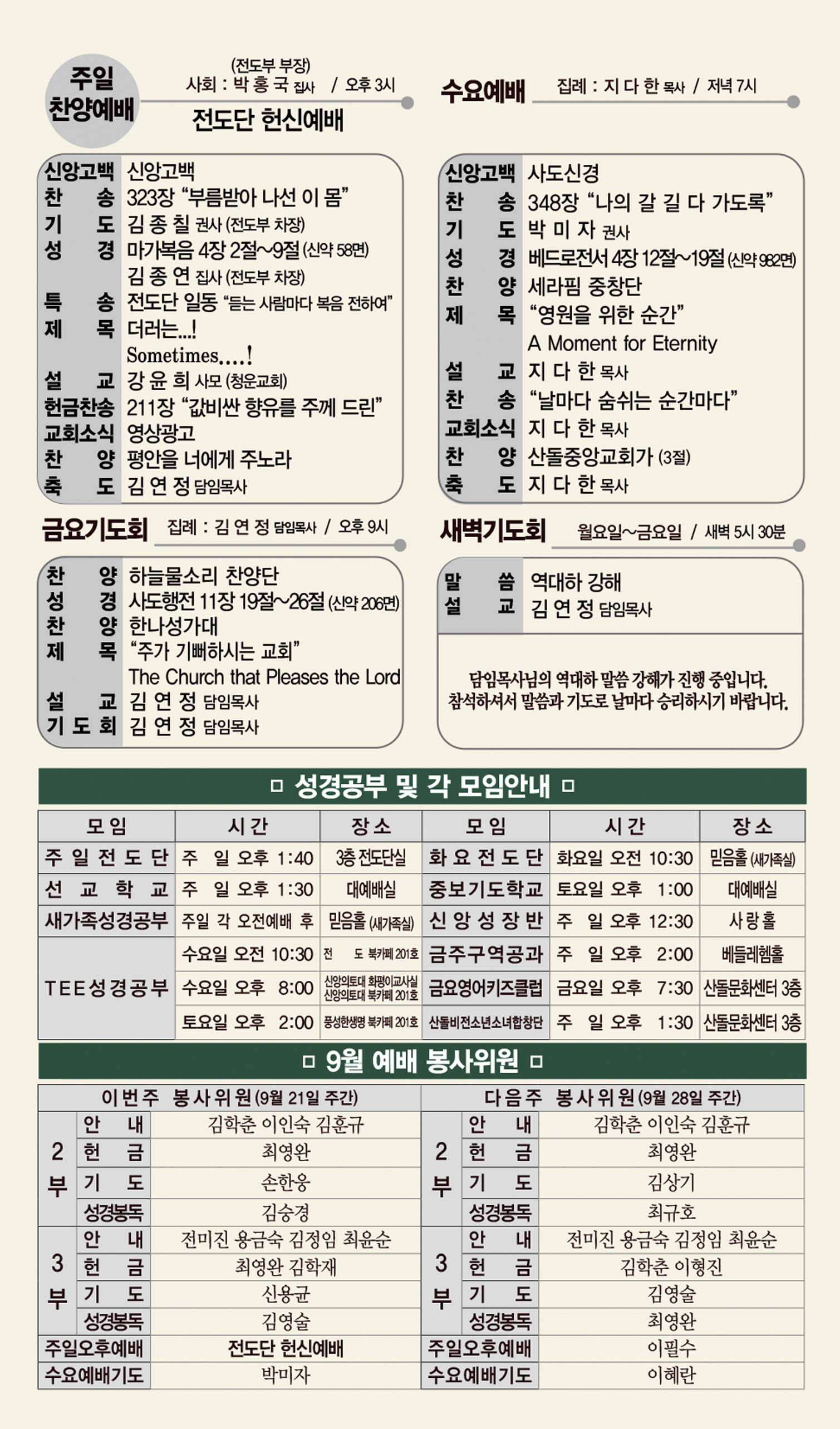 다음글 | 09월 14일 교회주보 | 운영자 | 2025.09.13 | 0 | 113 |