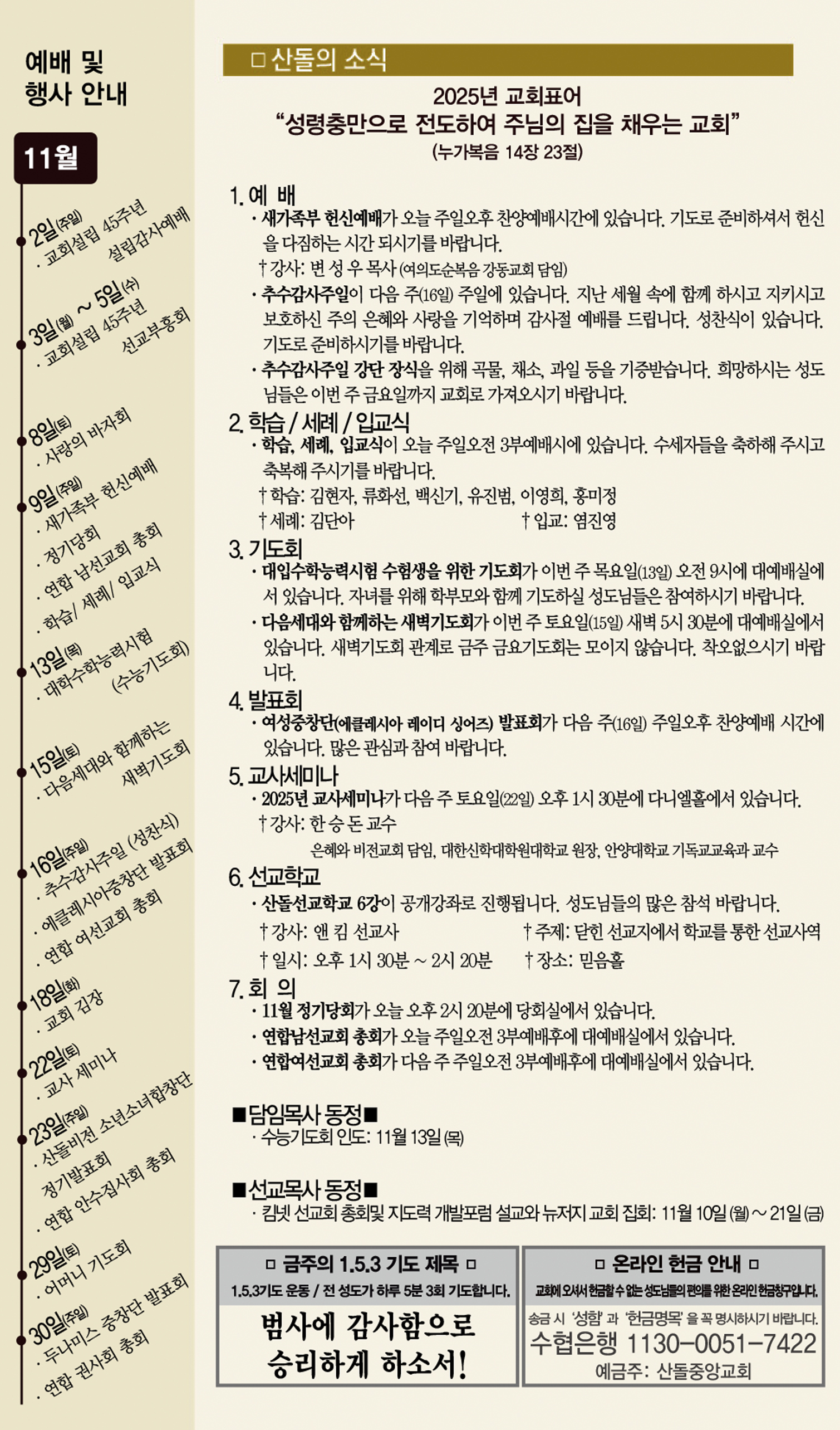 | 다음글 | 11월 02일 교회주보 | 운영자 | 2025.11.03 | 0 | 97 |