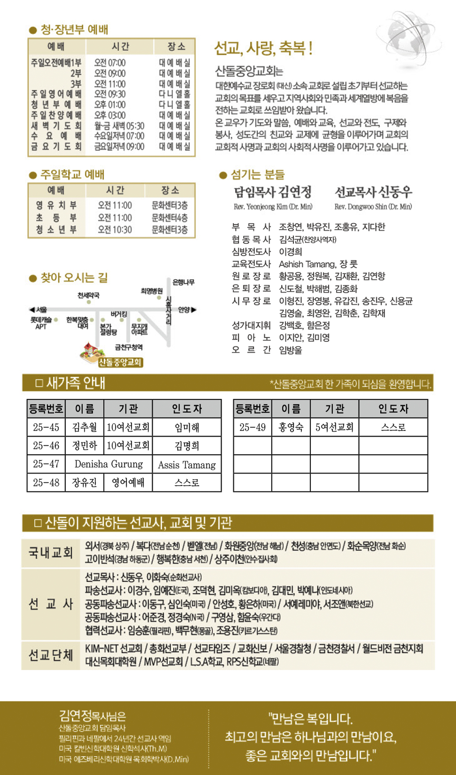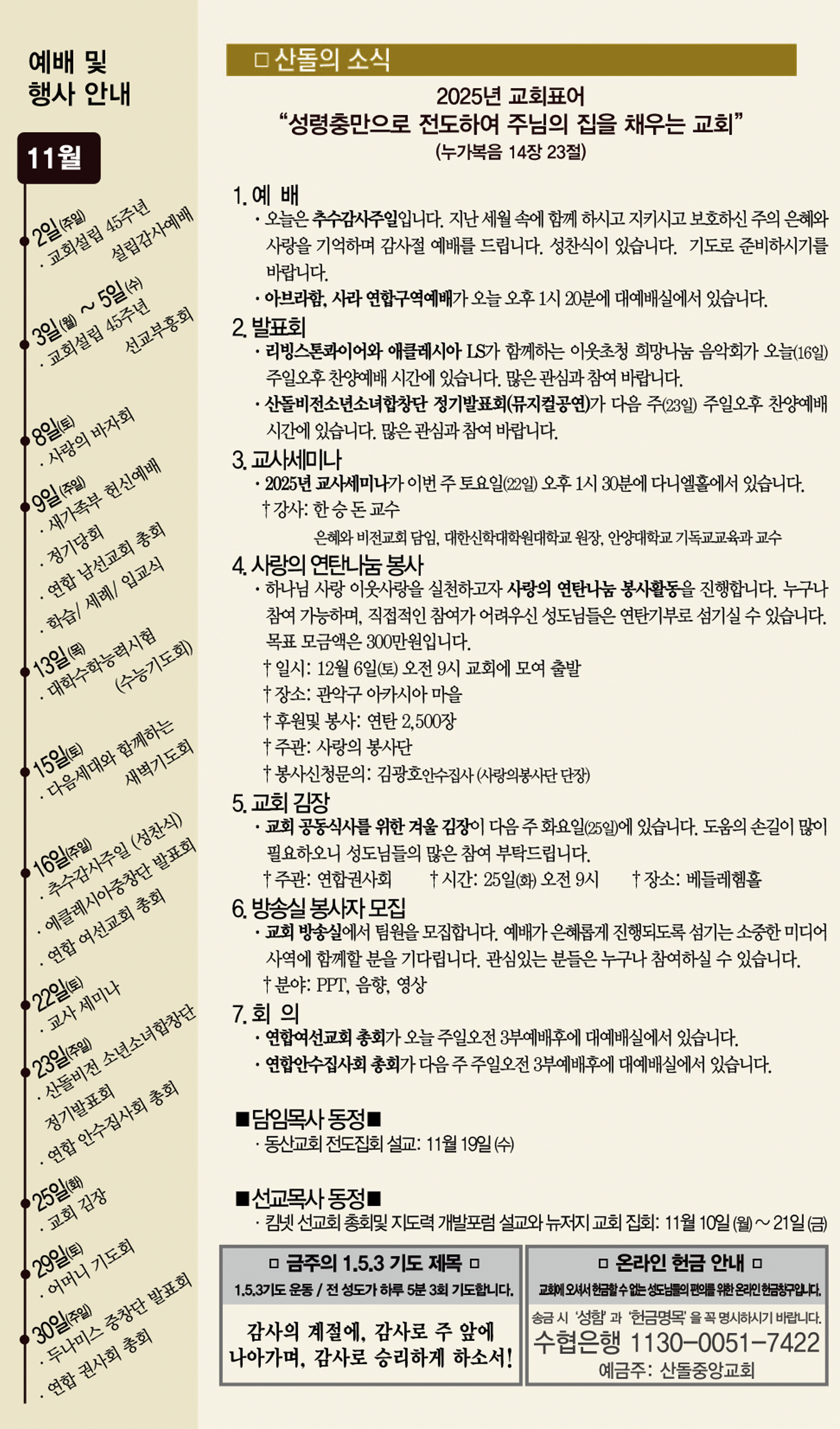 | 다음글 | 11월 09일 교회주보 | 운영자 | 2025.11.08 | 0 | 86 |