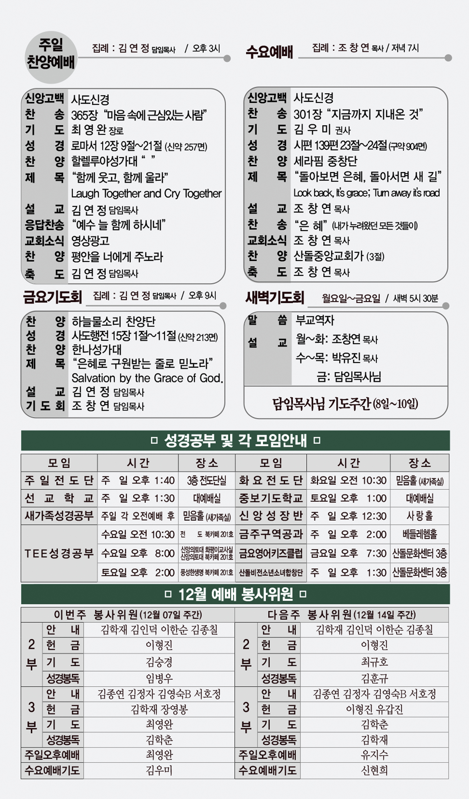 | 이전글 | 12월 14일 교회주보 | 운영자 | 2025.12.13 | 0 | 36 |