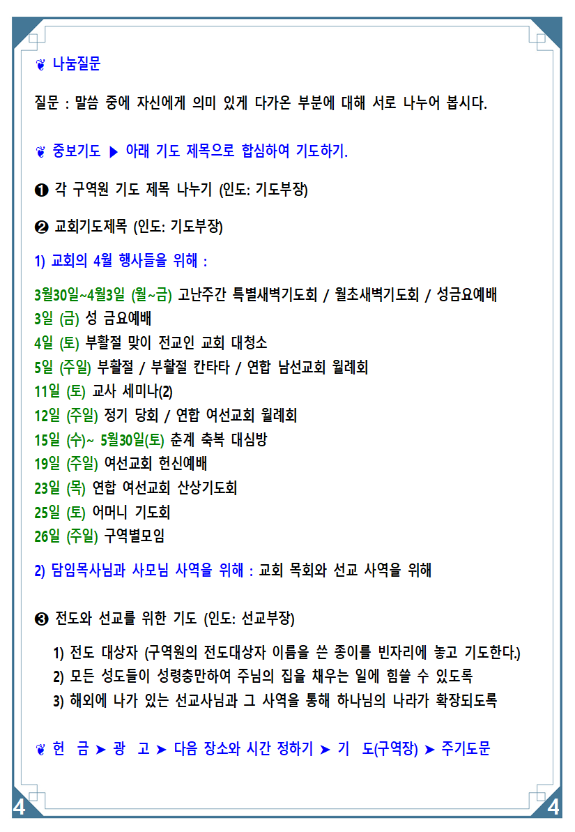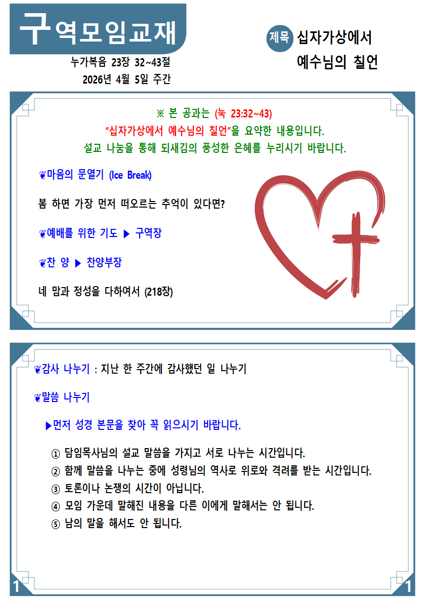 2026년 4월 5일 주간 구역모임 교재 박유진 2026-04-04 추천 0 댓글 0 조회 6 http://sandolch.co.kr/bbs/bbsView/80/6622612 첨부파일 (0) 0