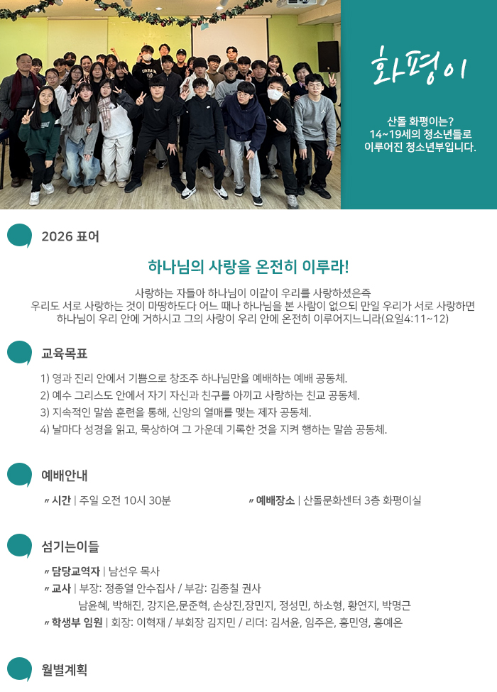월 활동 월 활동 1월 신입생 환영회, 우리반 단합대회, 동계수련회 2월 예배실 및 교사실 환경정리 3월 반별 고린도전서 통독 4월 부활주일, 고린도전서 성경퀴즈 5월 어버이주일 샌드위치 만들기 6월 친구 초청 잔치 7월 여름 수련회 8월 우리반 단합대회 9월 추석맞이행사 10월 야외예배 11월 추수감사주일, 화평이 총회 12월 성탄맞이 예배실 꾸미기 성탄 발표회, 졸업예배