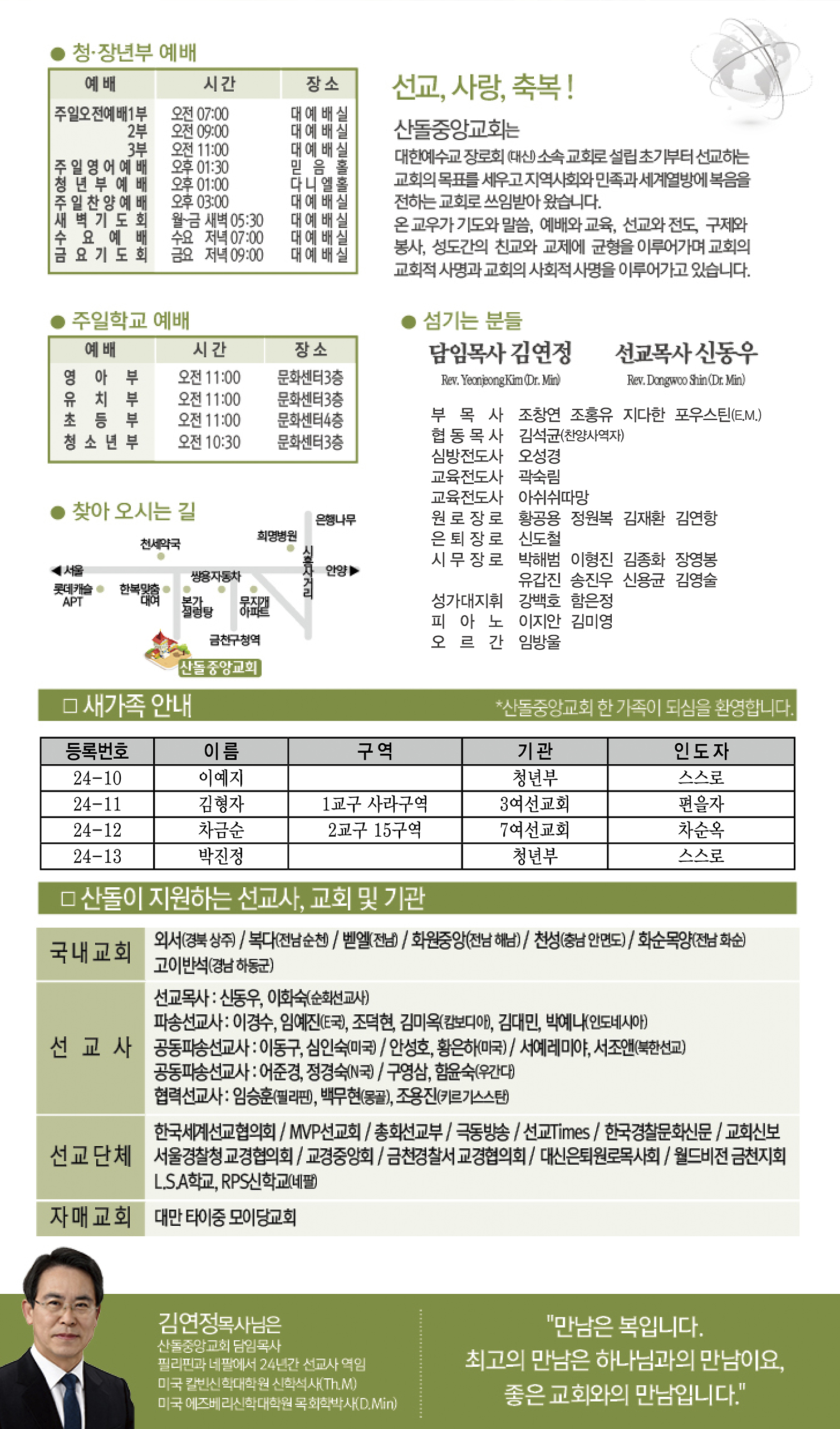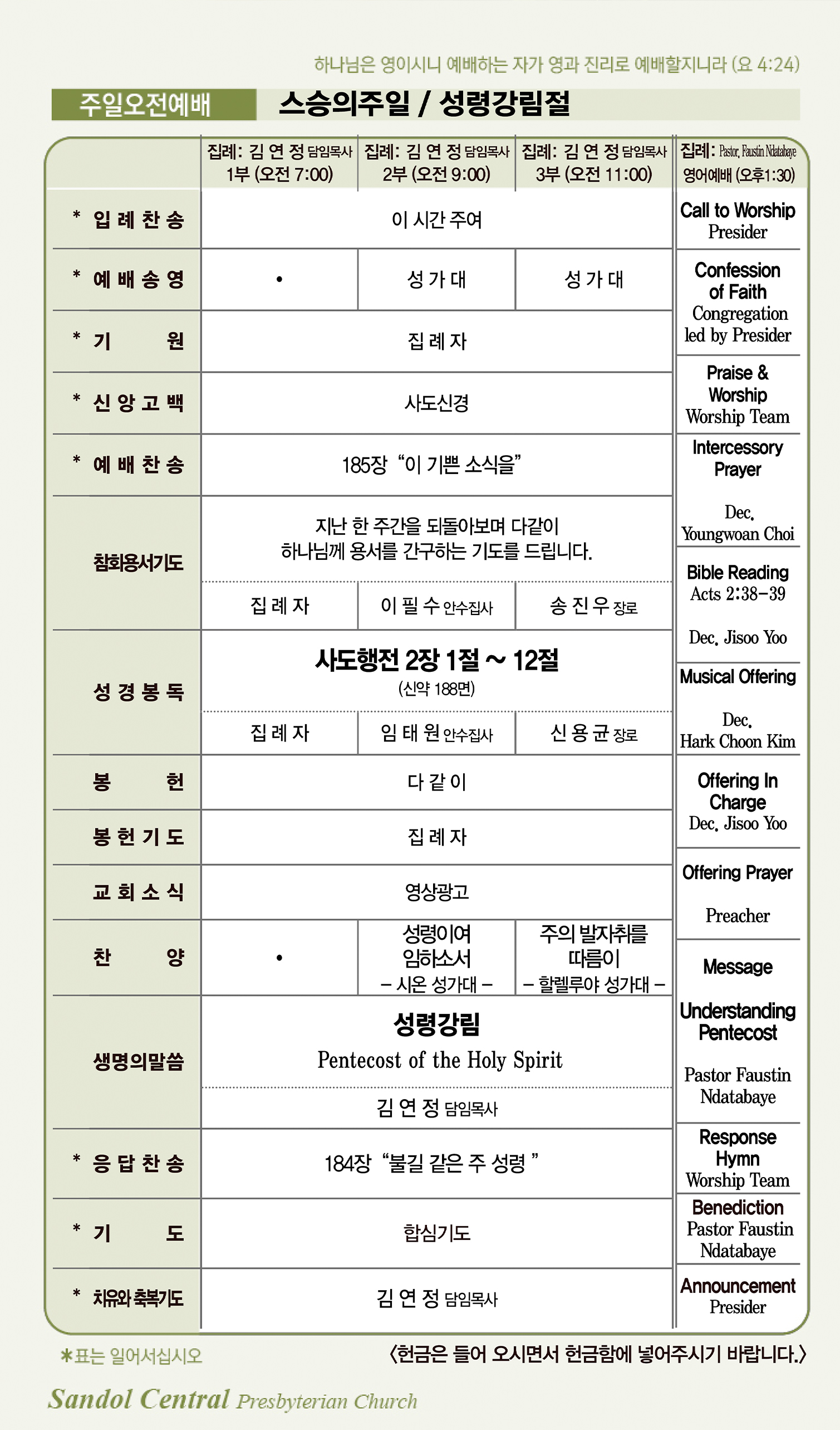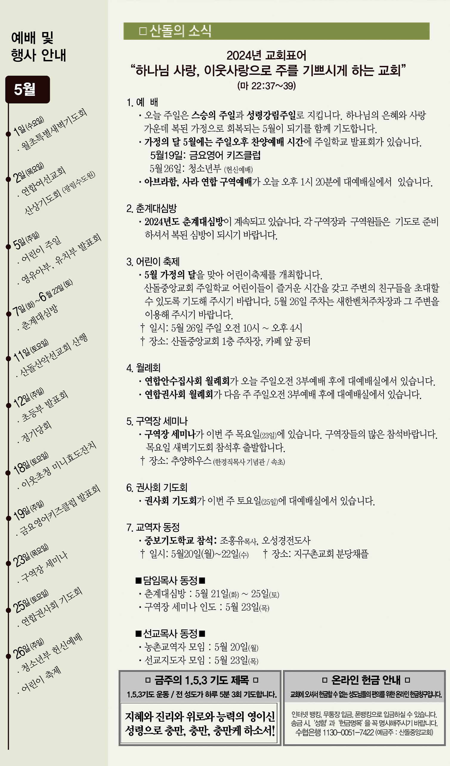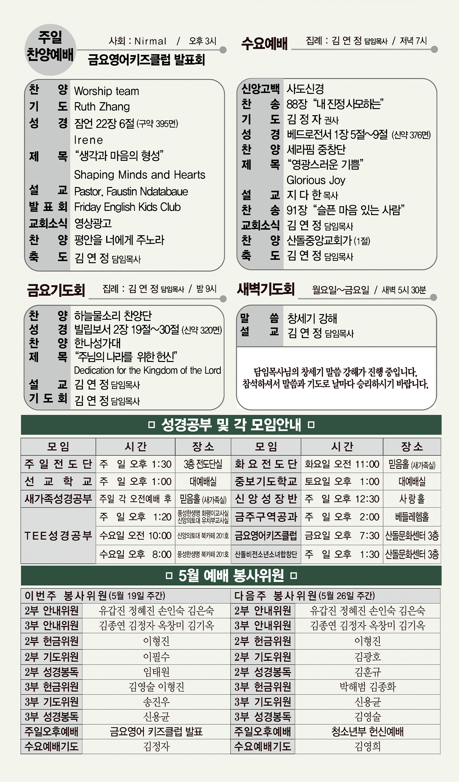 | 이전글 | 05월 26일 교회주보 | 운영자 | 2024.05.25 | 0 | 428 |