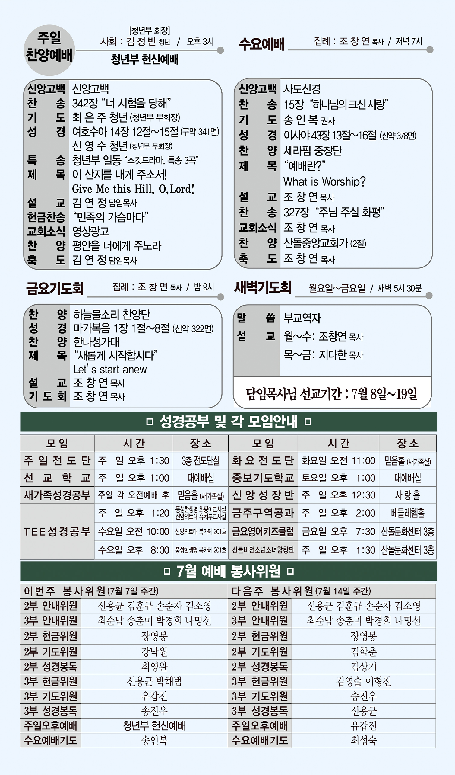 | 이전글 | 07월 14일 교회주보 | 운영자 | 2024.07.13 | 1 | 407 |