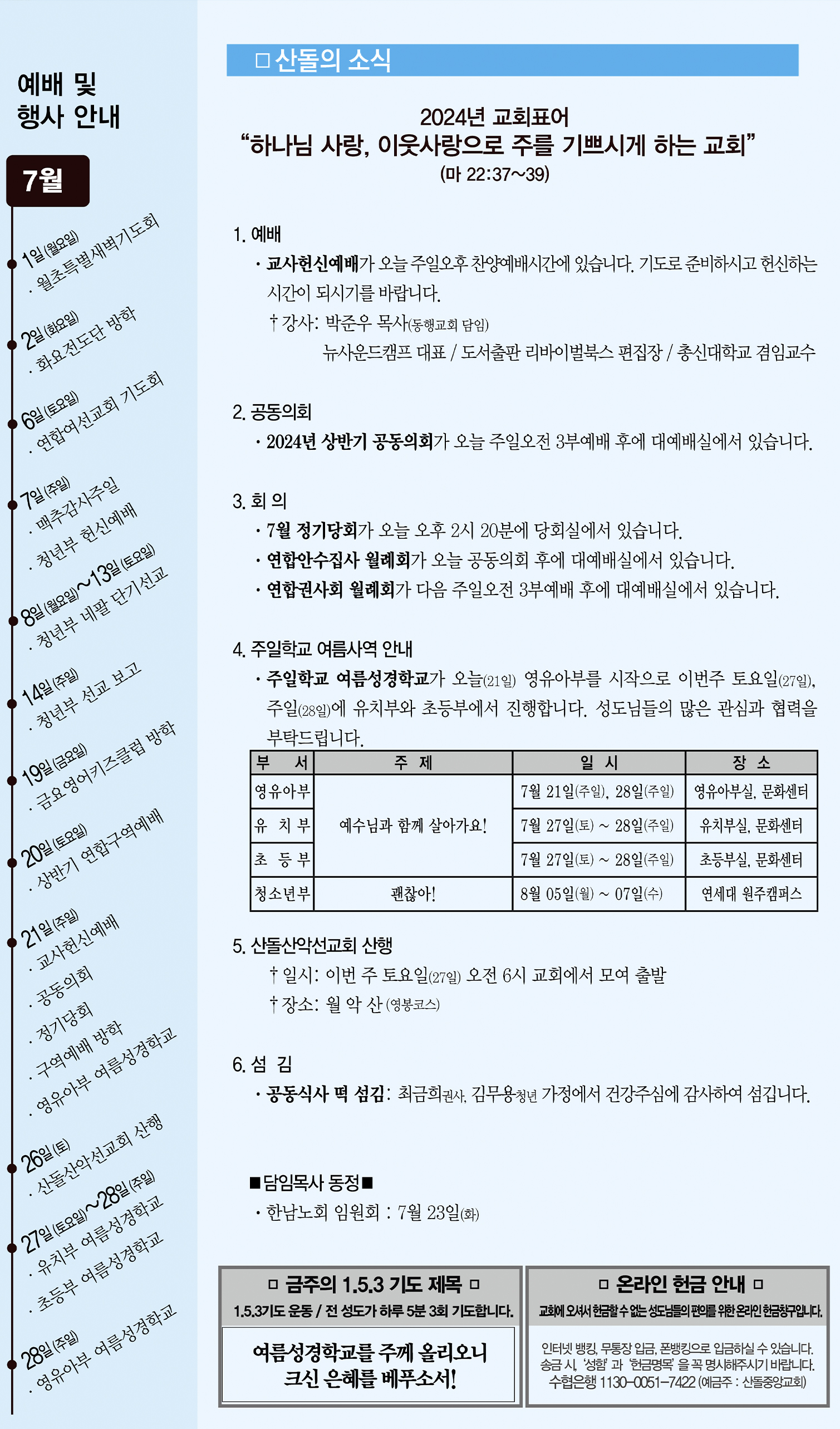 | 다음글 | 07월 14일 교회주보 | 운영자 | 2024.07.13 | 1 | 406 |