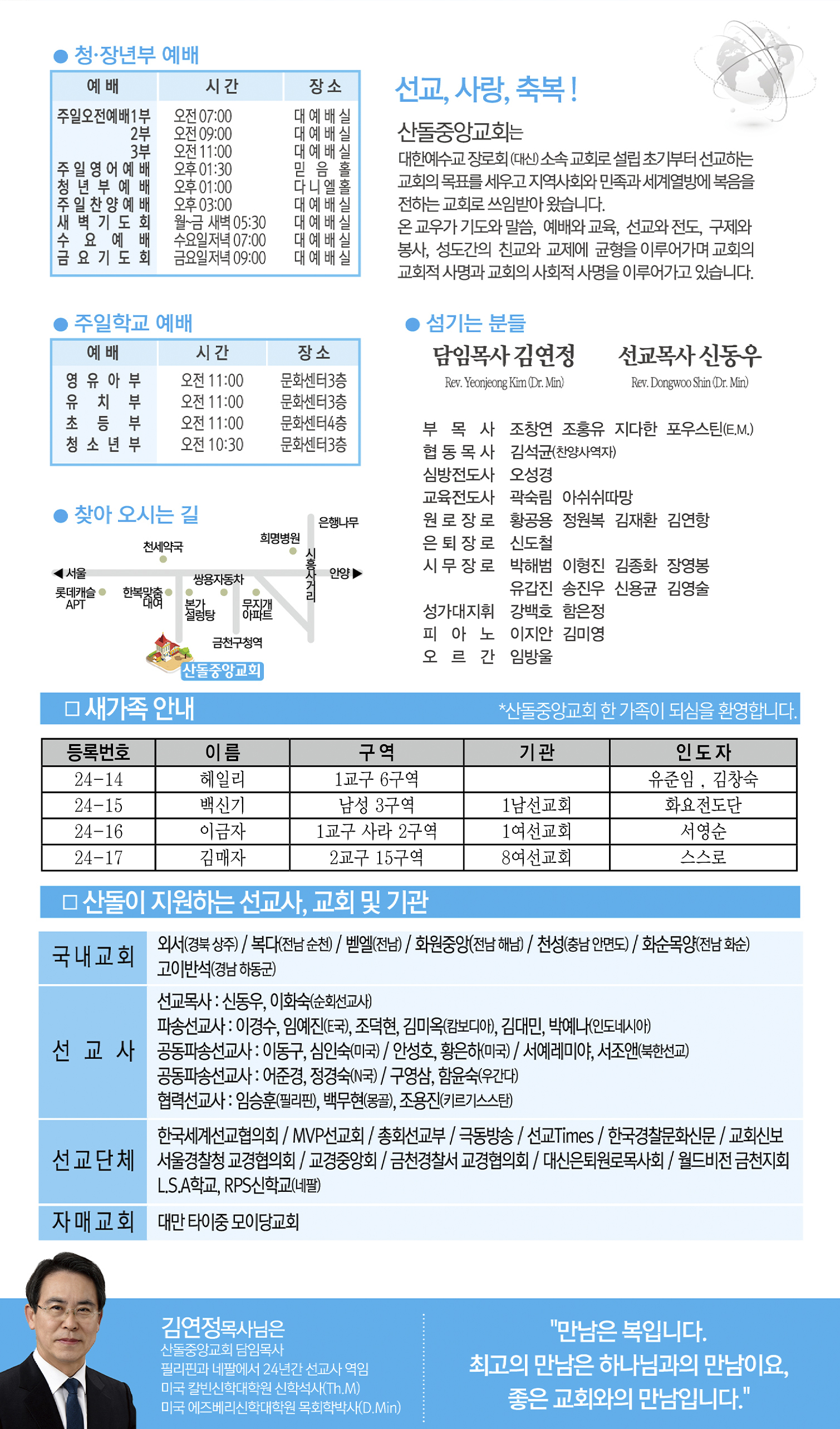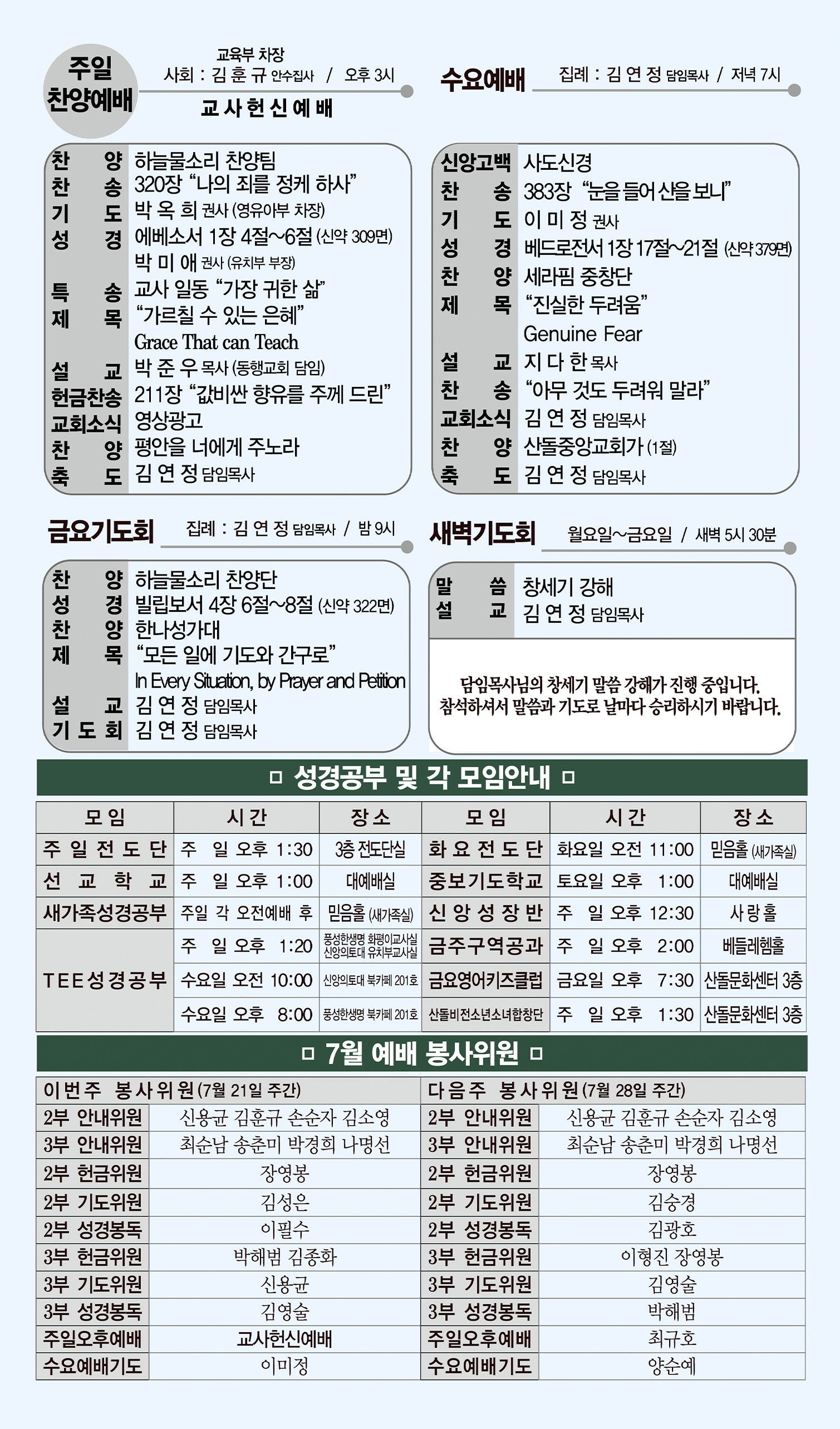 | 이전글 | 07월 28일 교회주보 | 운영자 | 2024.07.27 | 1 | 369 |