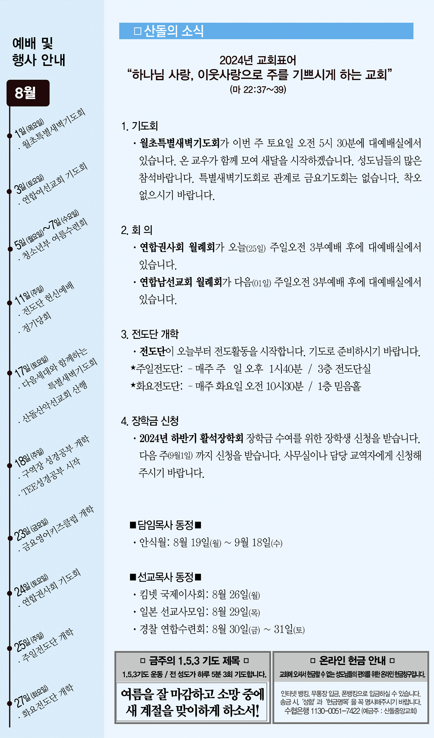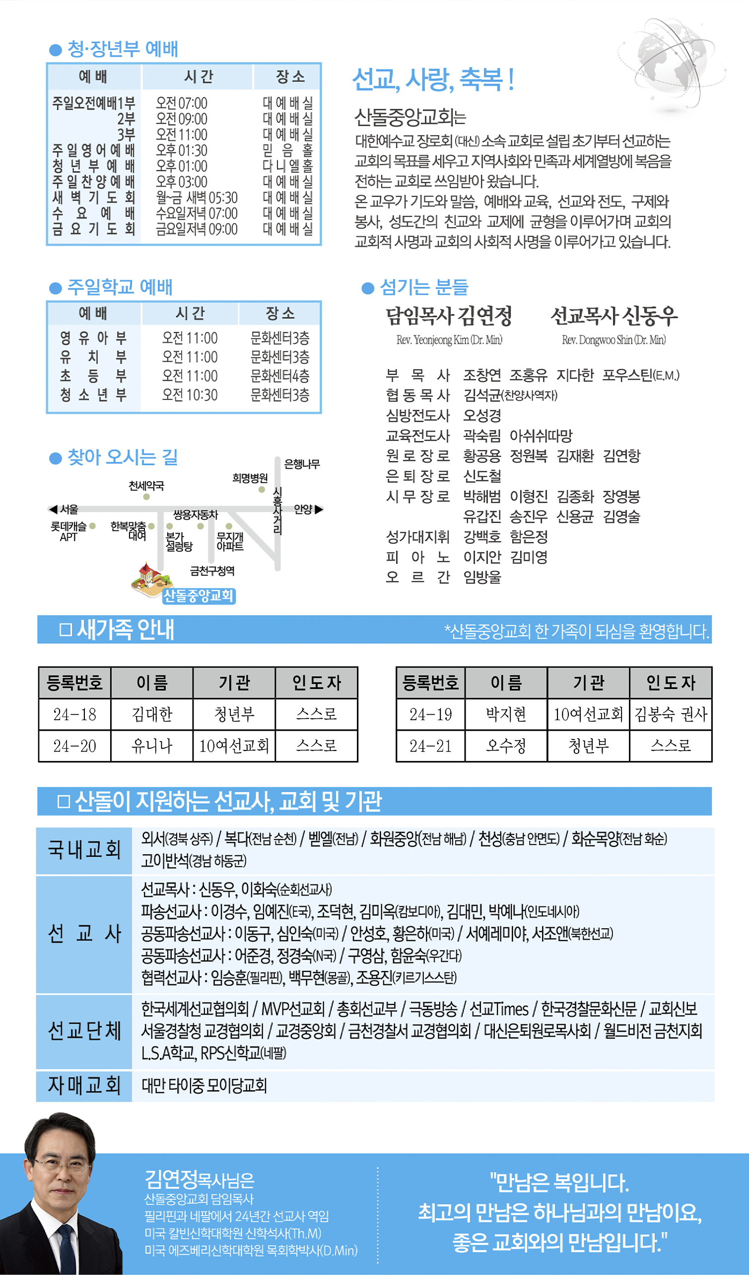 | 다음글 | 08월 18일 교회주보 | 운영자 | 2024.08.17 | 3 | 431 |