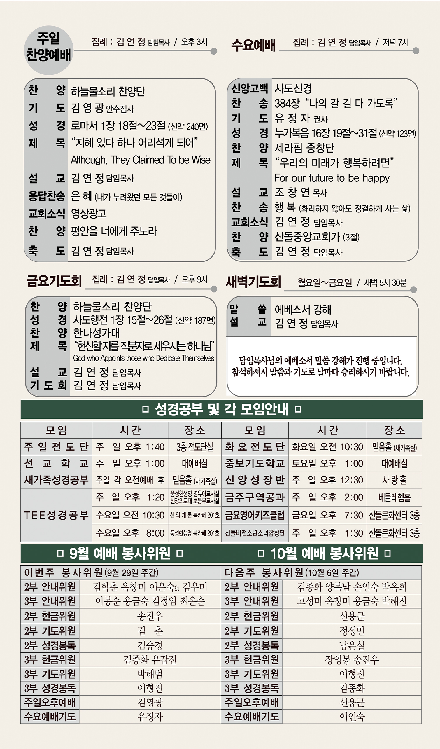 | 다음글 | 09월 22일 교회주보 | 운영자 | 2024.09.21 | 1 | 450 |
