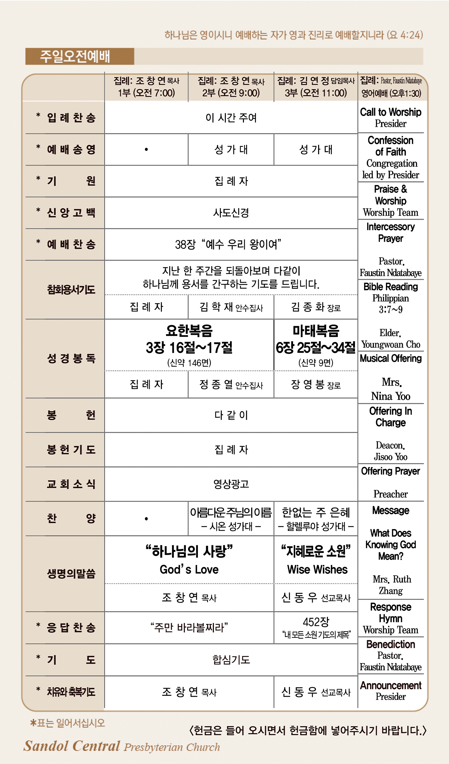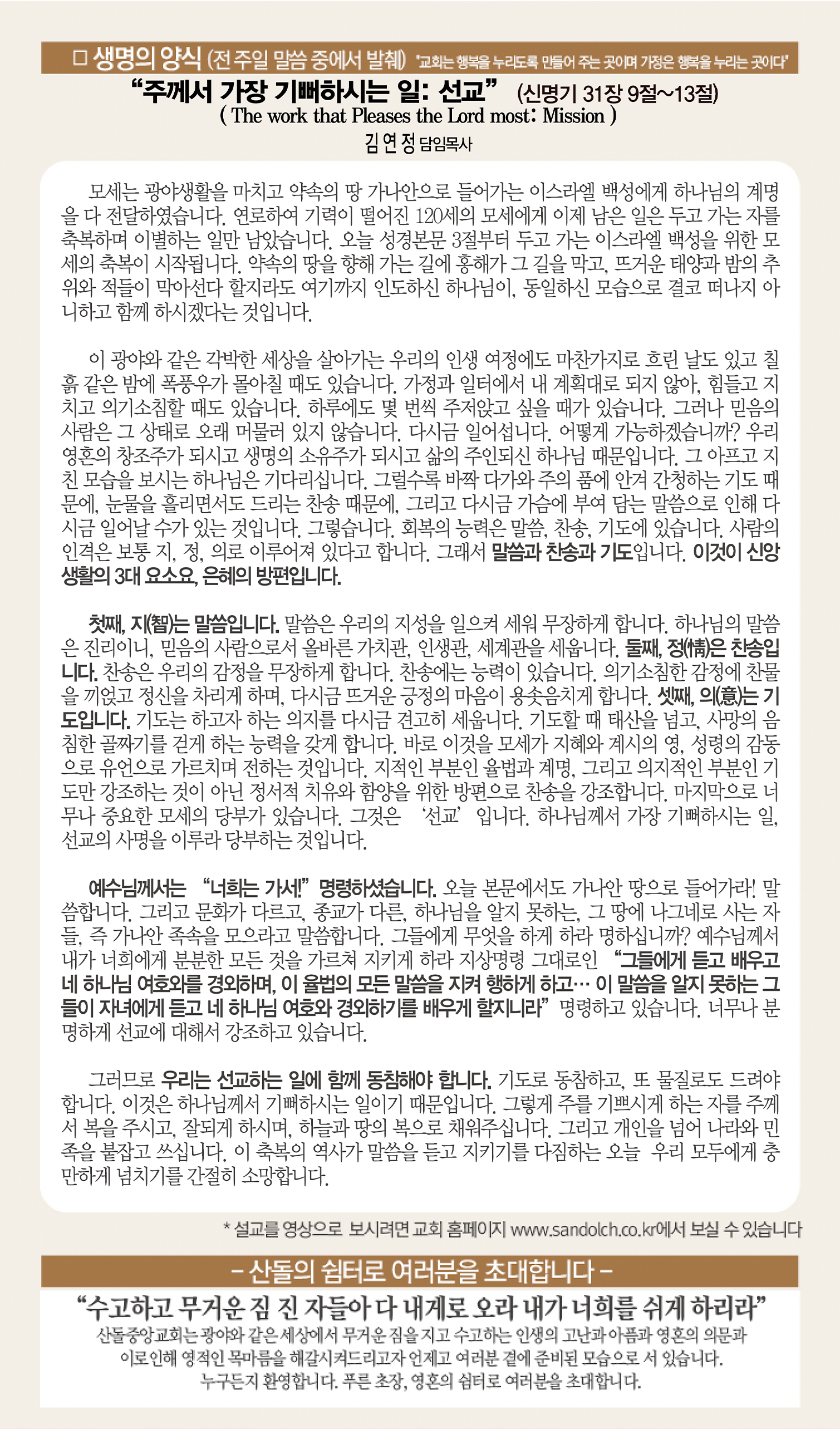 | 이전글 | 10월 20일 교회주보 | 운영자 | 2024.10.19 | 1 | 406 |