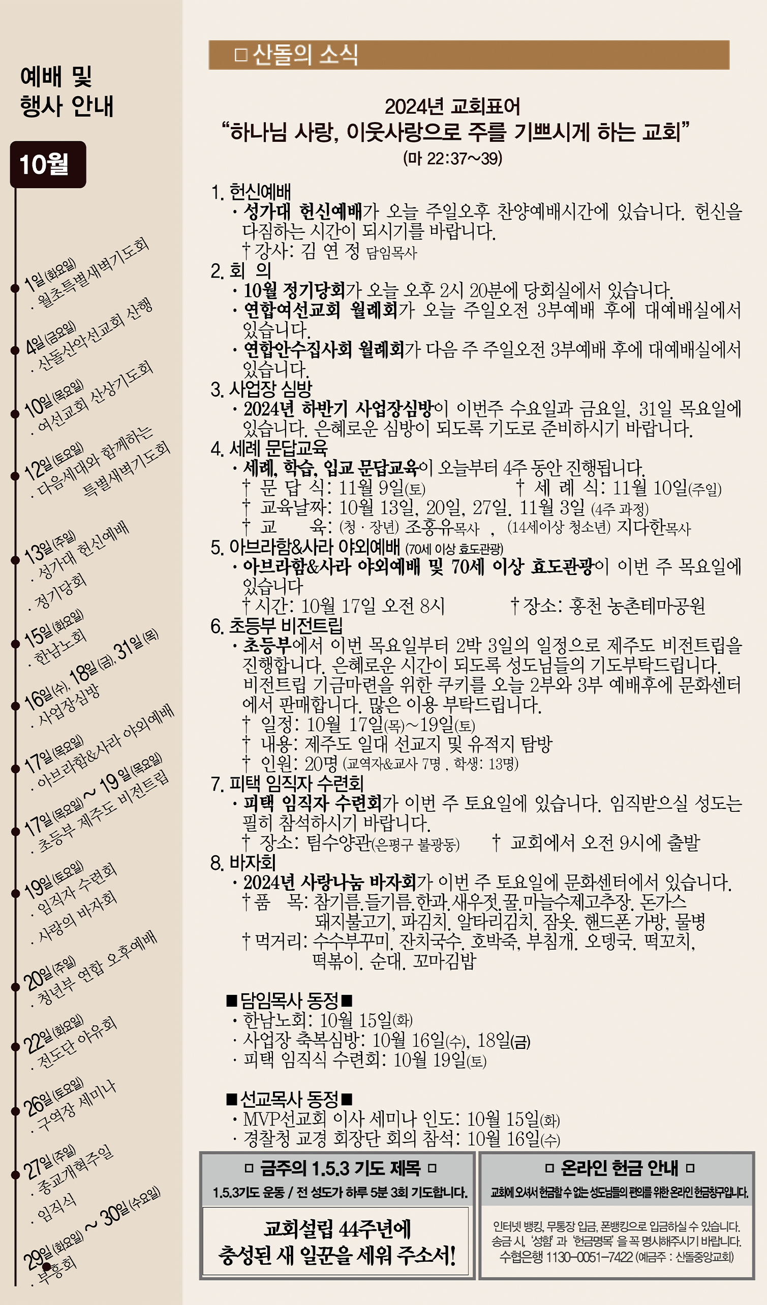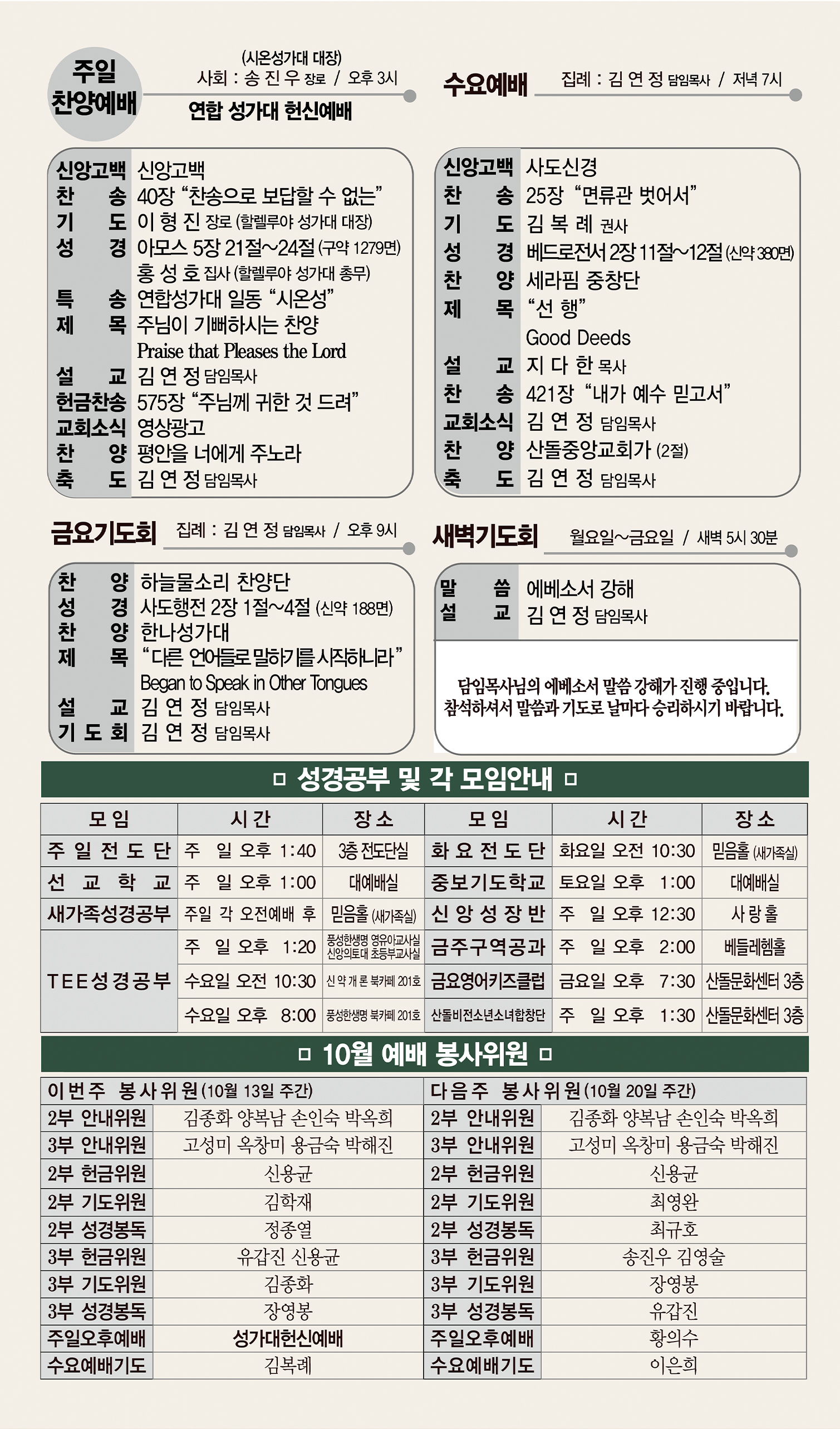 | 다음글 | 10월 06일 교회주보 | 운영자 | 2024.10.05 | 3 | 438 |