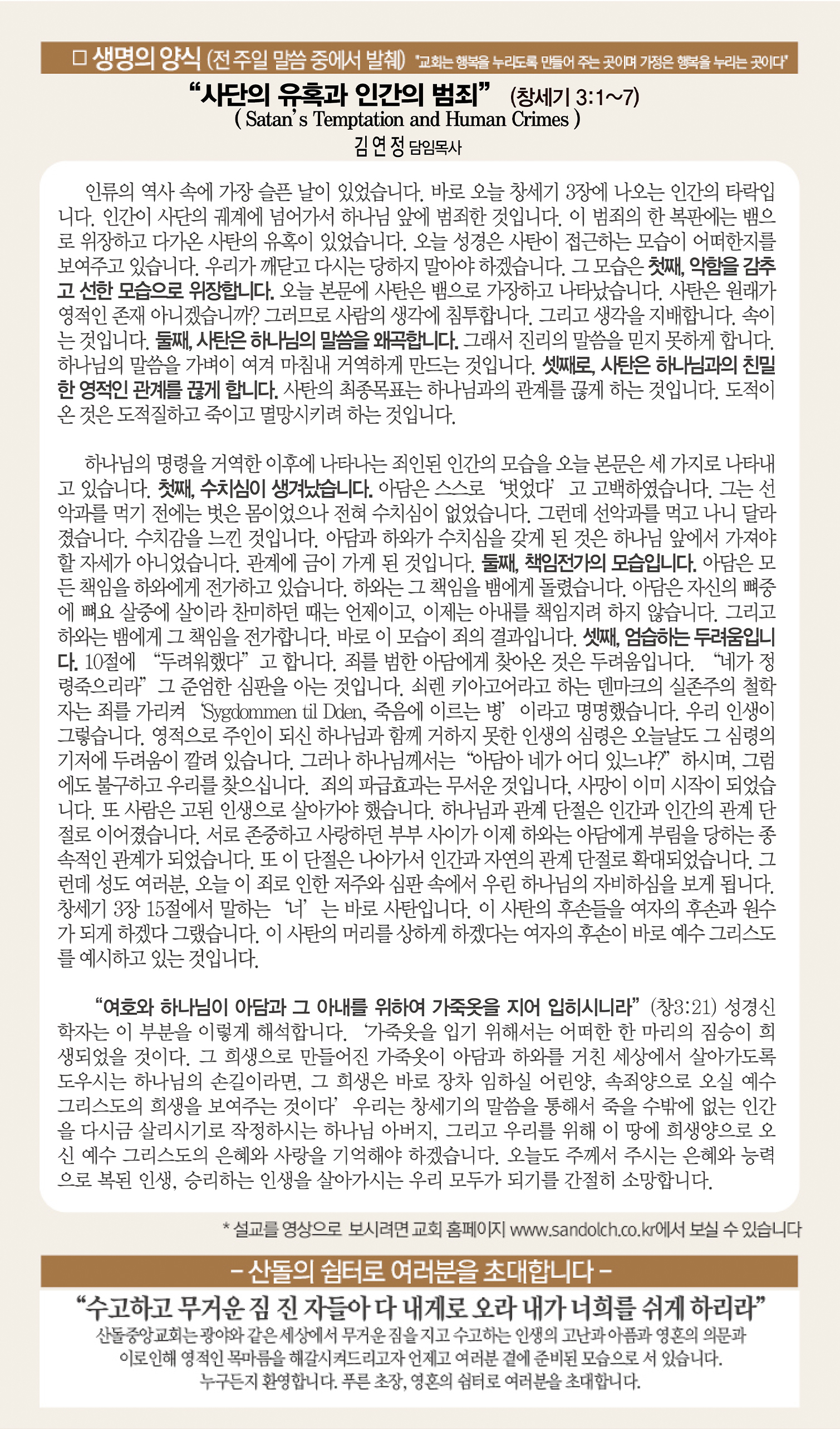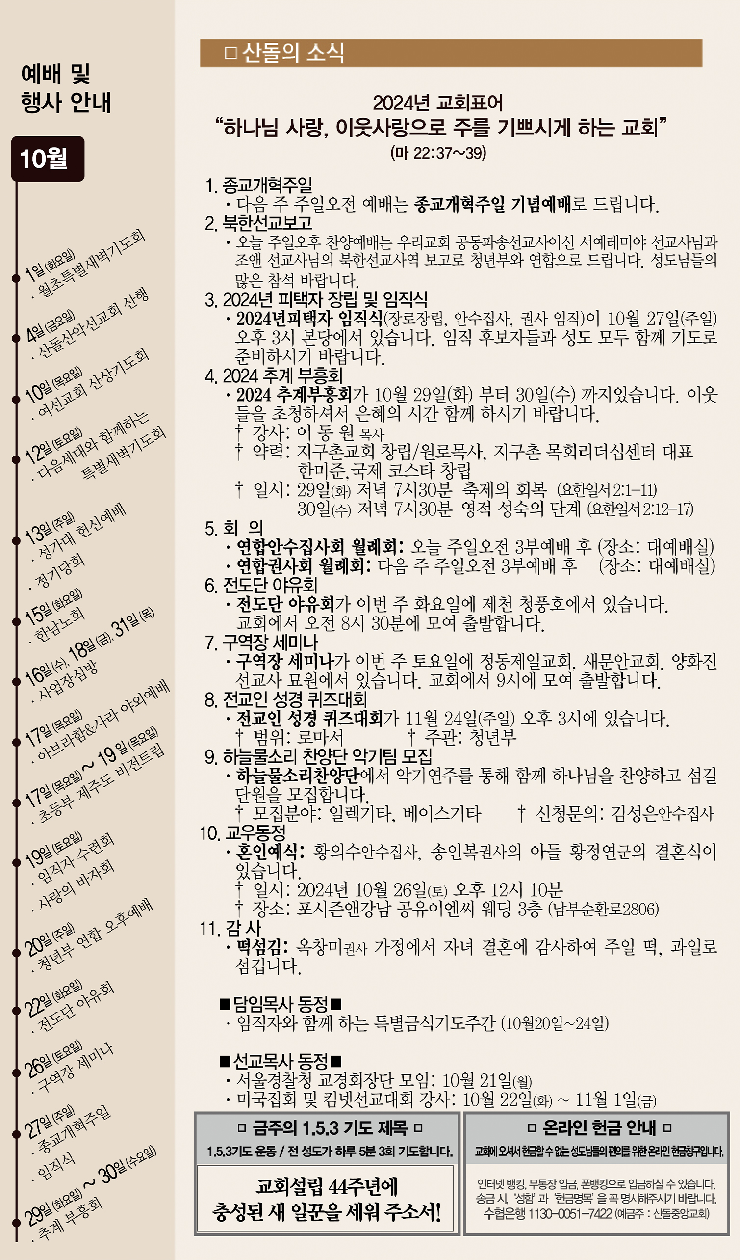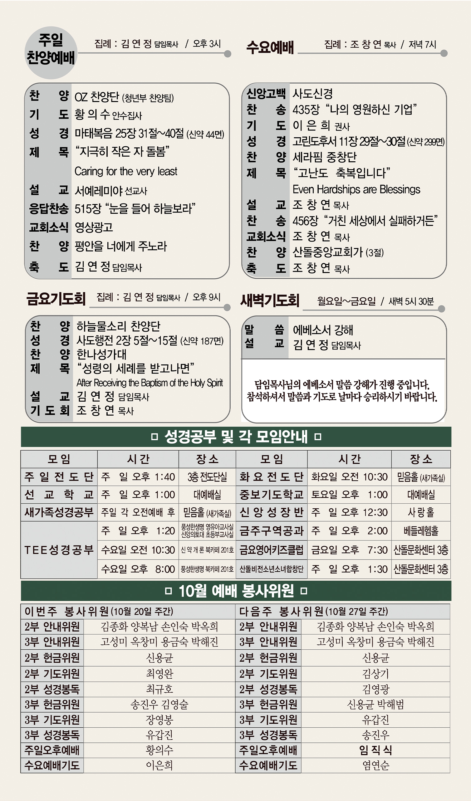 | 이전글 | 10월 26일 교회주보 | 운영자 | 2024.10.26 | 1 | 402 |