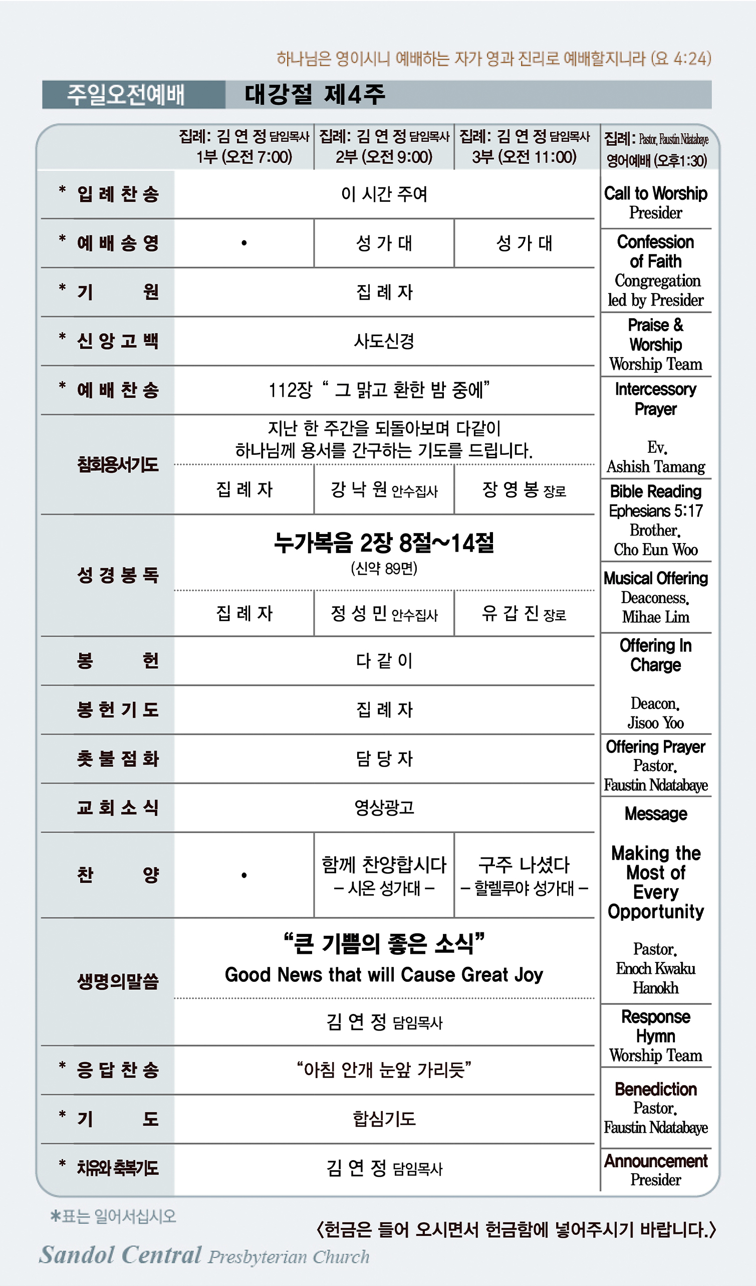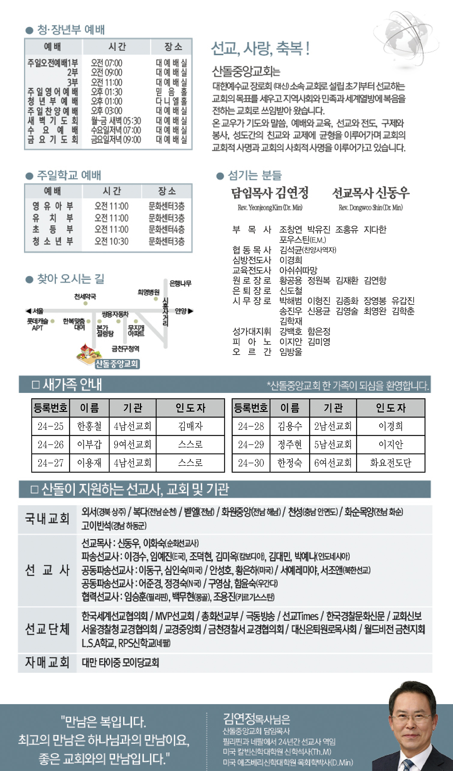 | 이전글 | 12월 29일 교회주보 | 운영자 | 2024.12.28 | 1 | 370 |