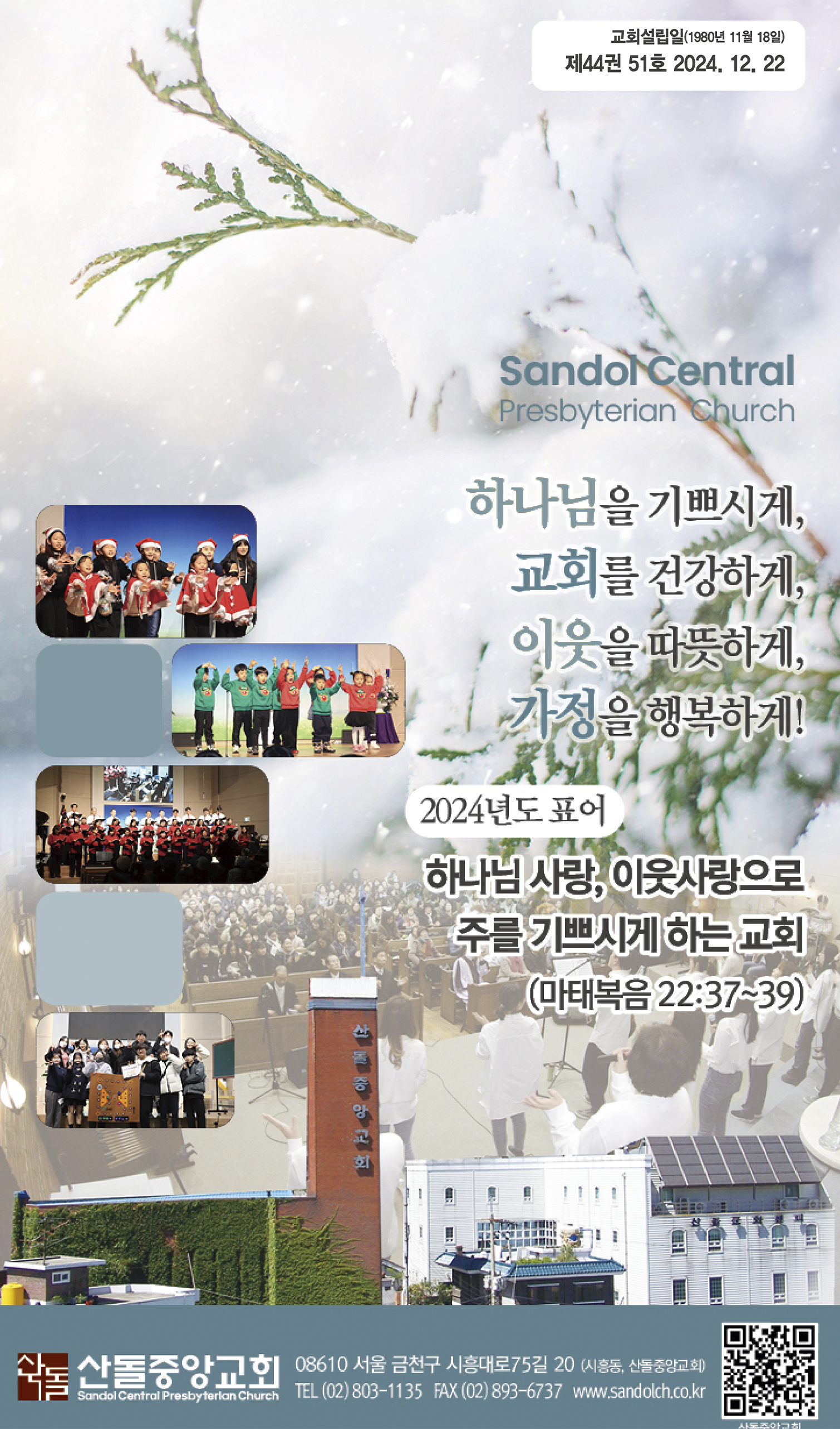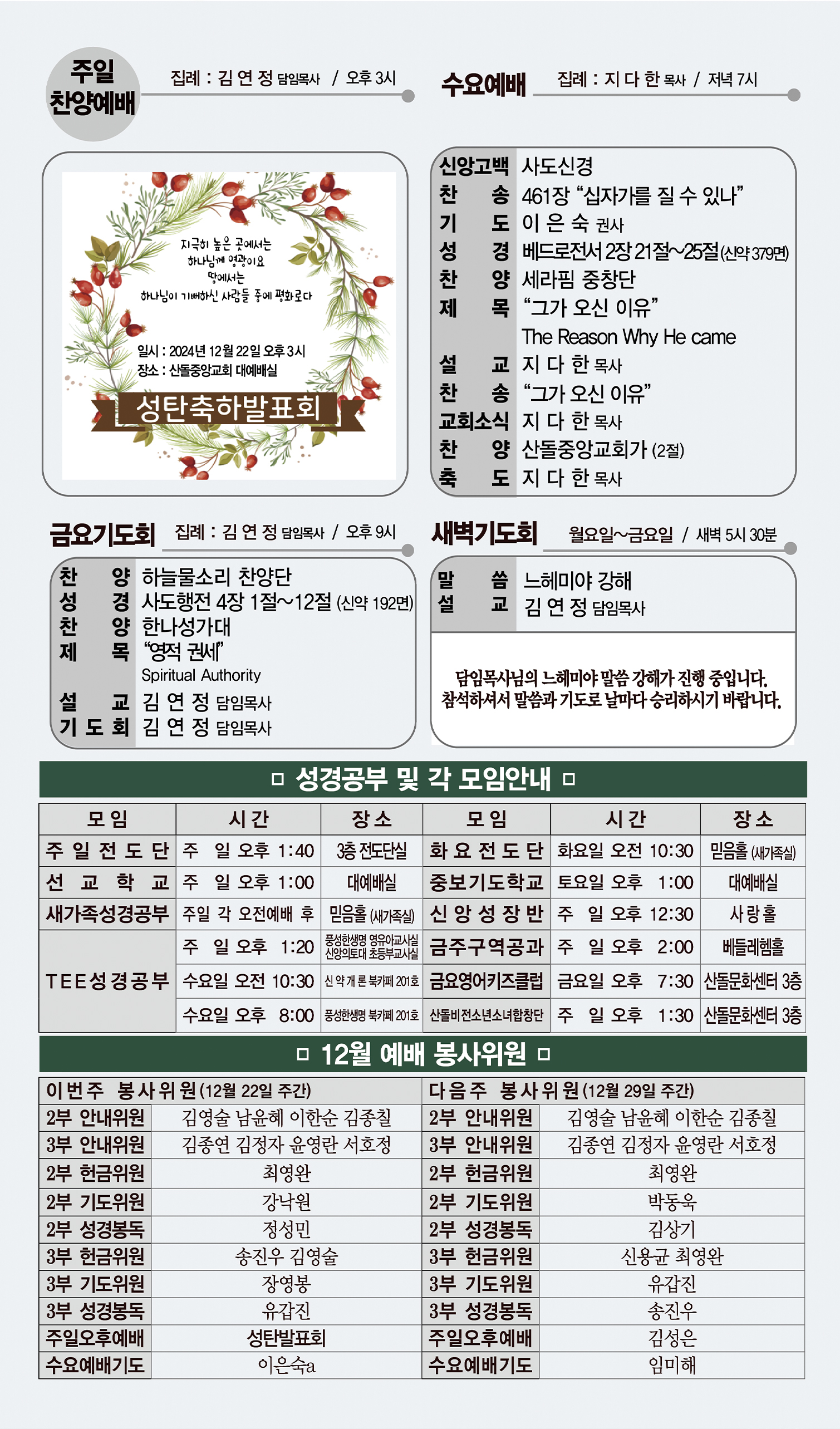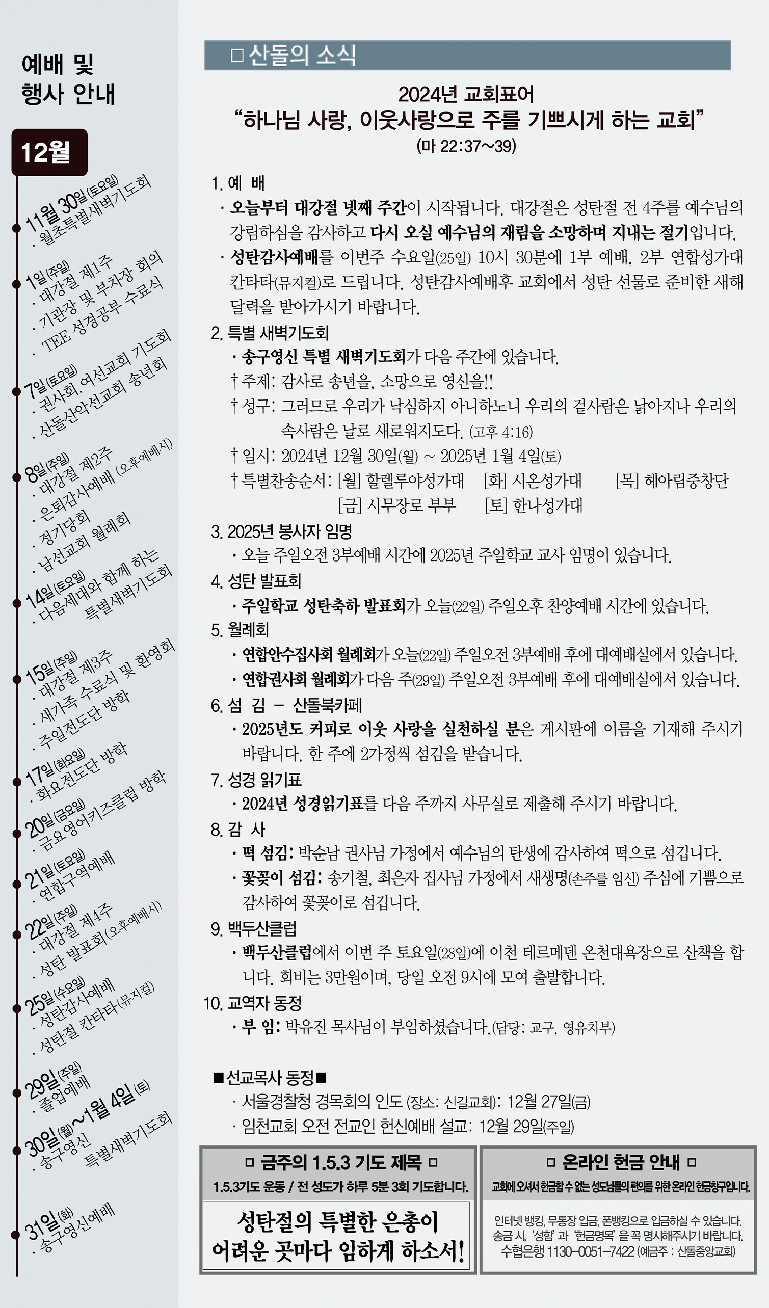 | 다음글 | 12월 15일 교회주보 | 운영자 | 2024.12.14 | 1 | 393 |