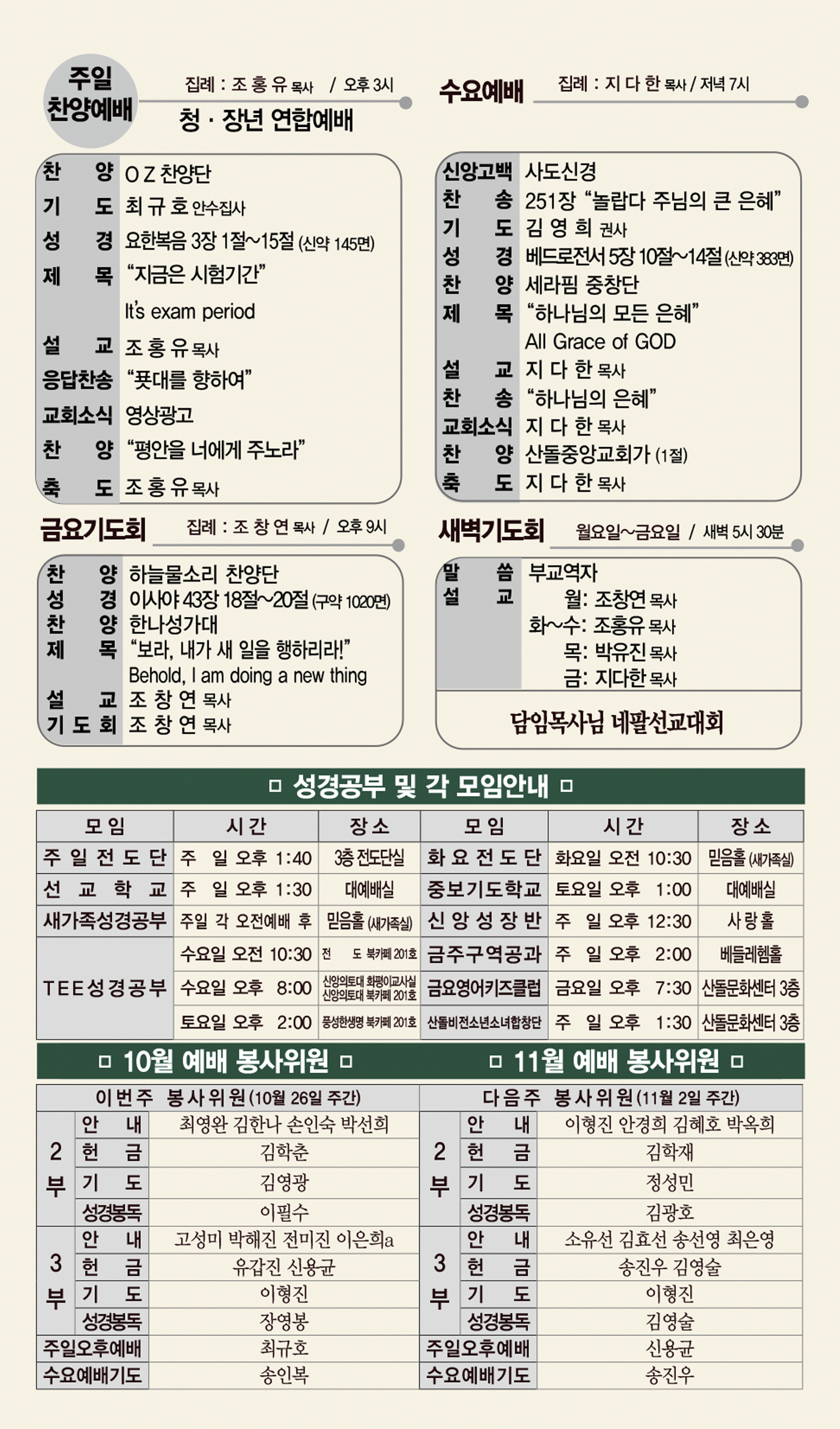 | 이전글 | 11월 02일 교회주보 | 운영자 | 2025.11.03 | 0 | 118 |