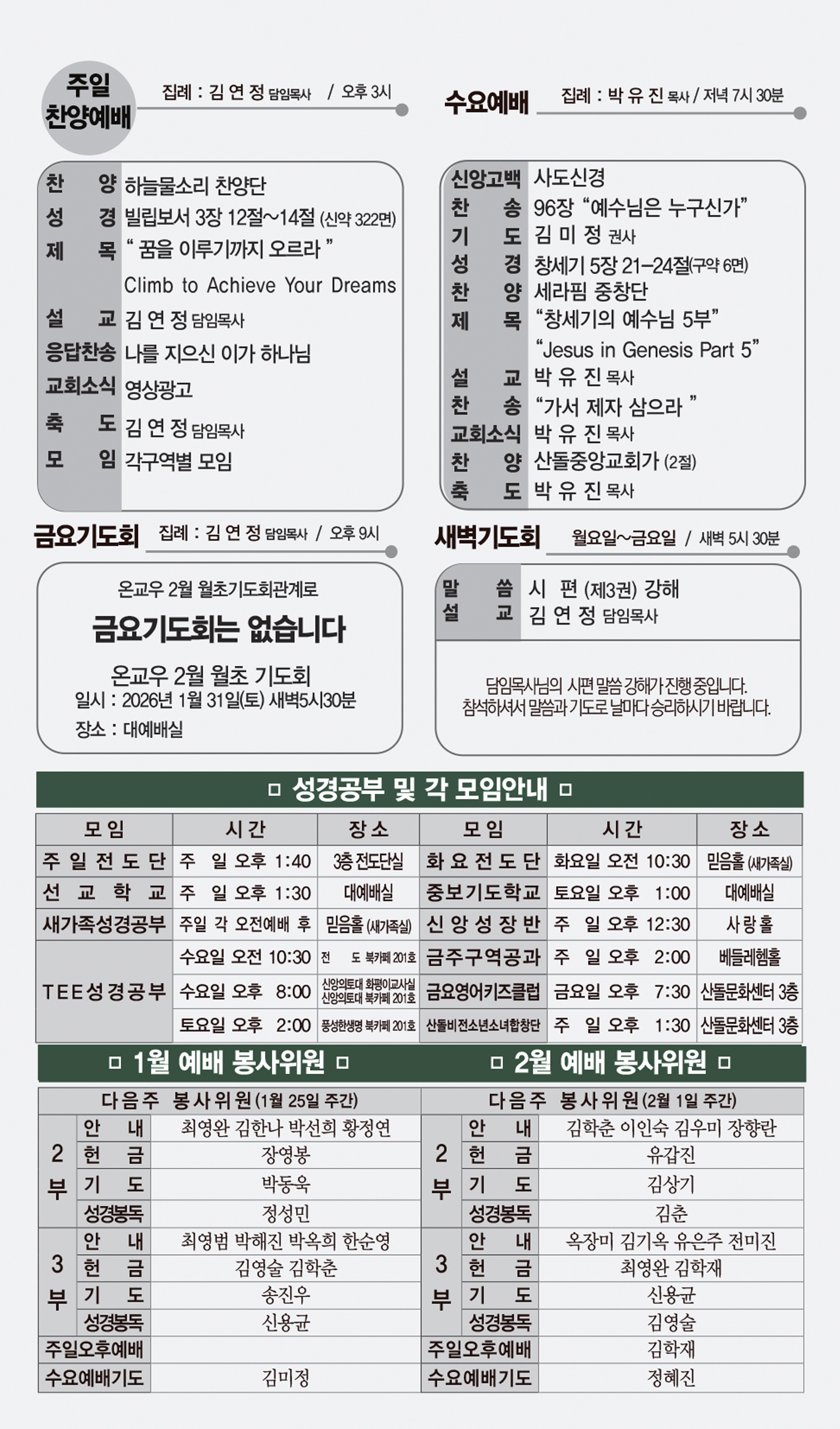 | 이전글 | 02월 01일 교회주보 | 운영자 | 2026.01.31 | 0 | 138 |
