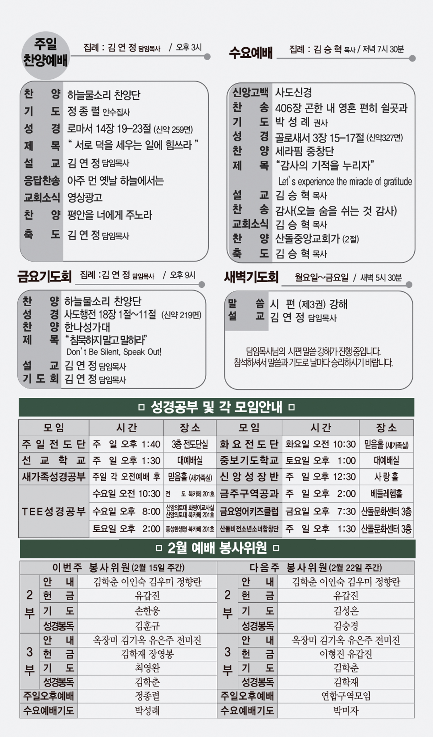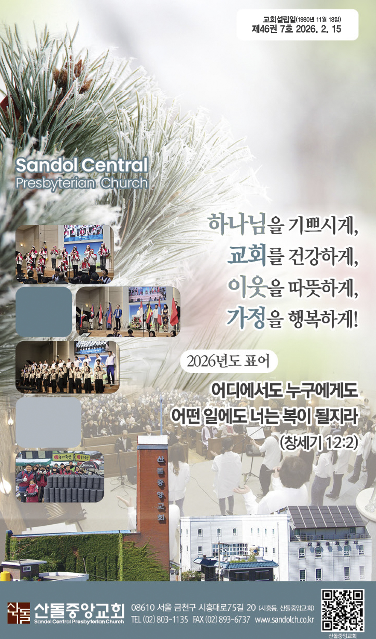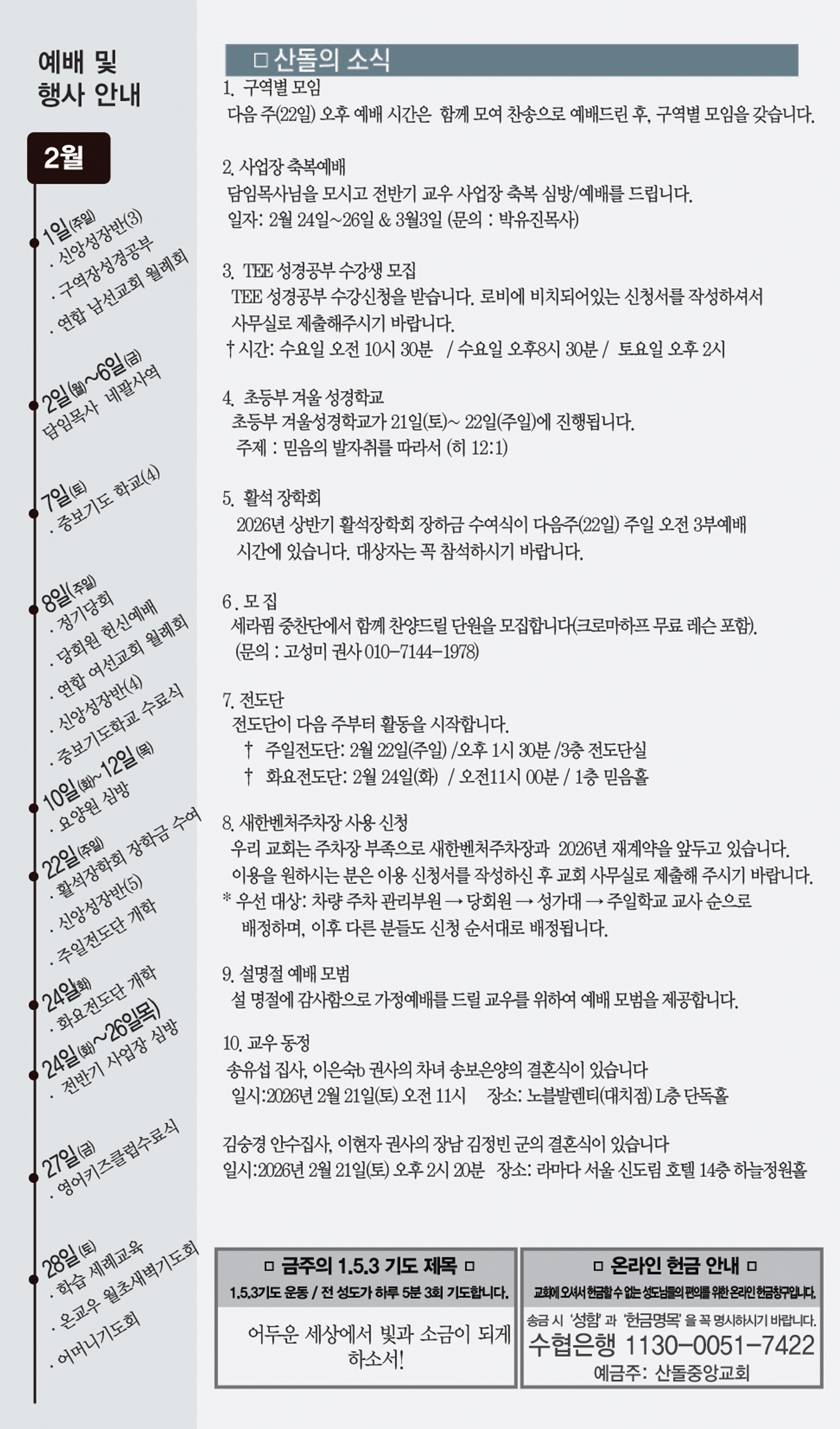 | 다음글 | 02월 08일 교회주보 | 운영자 | 2026.02.07 | 0 | 117 |