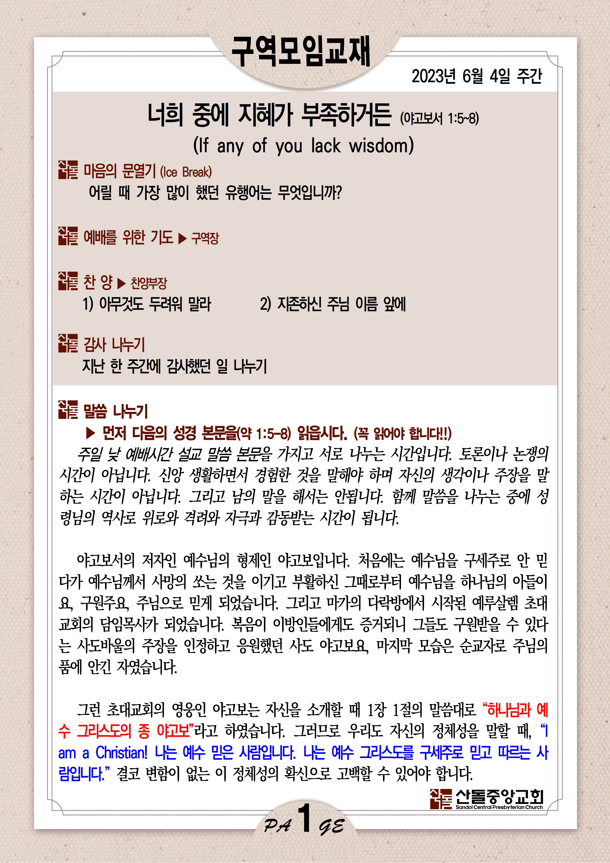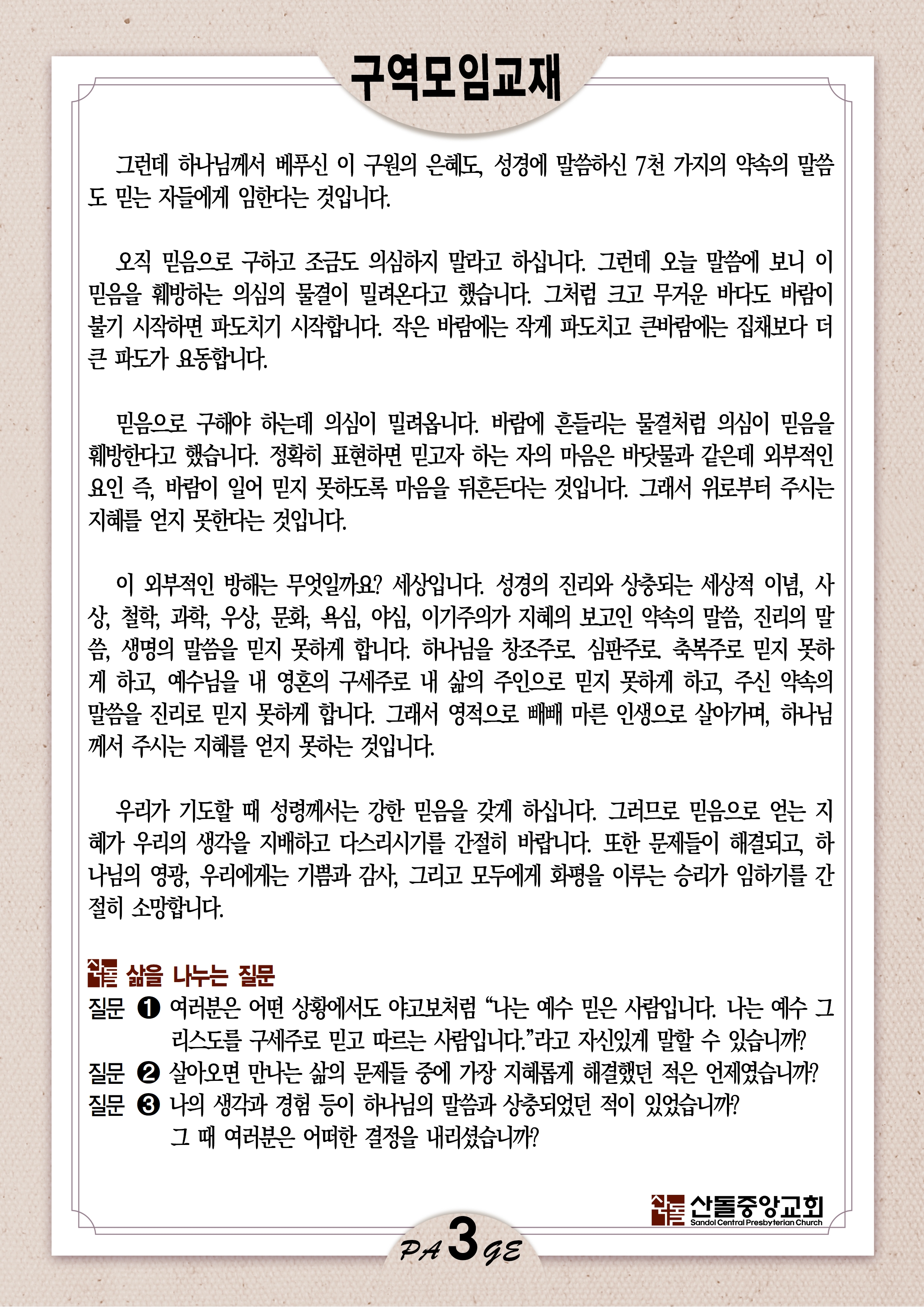 | 이전글 | 6월 11일 주간 구역모임교재 | 조창연 | 2023.06.10 | 0 | 431 |