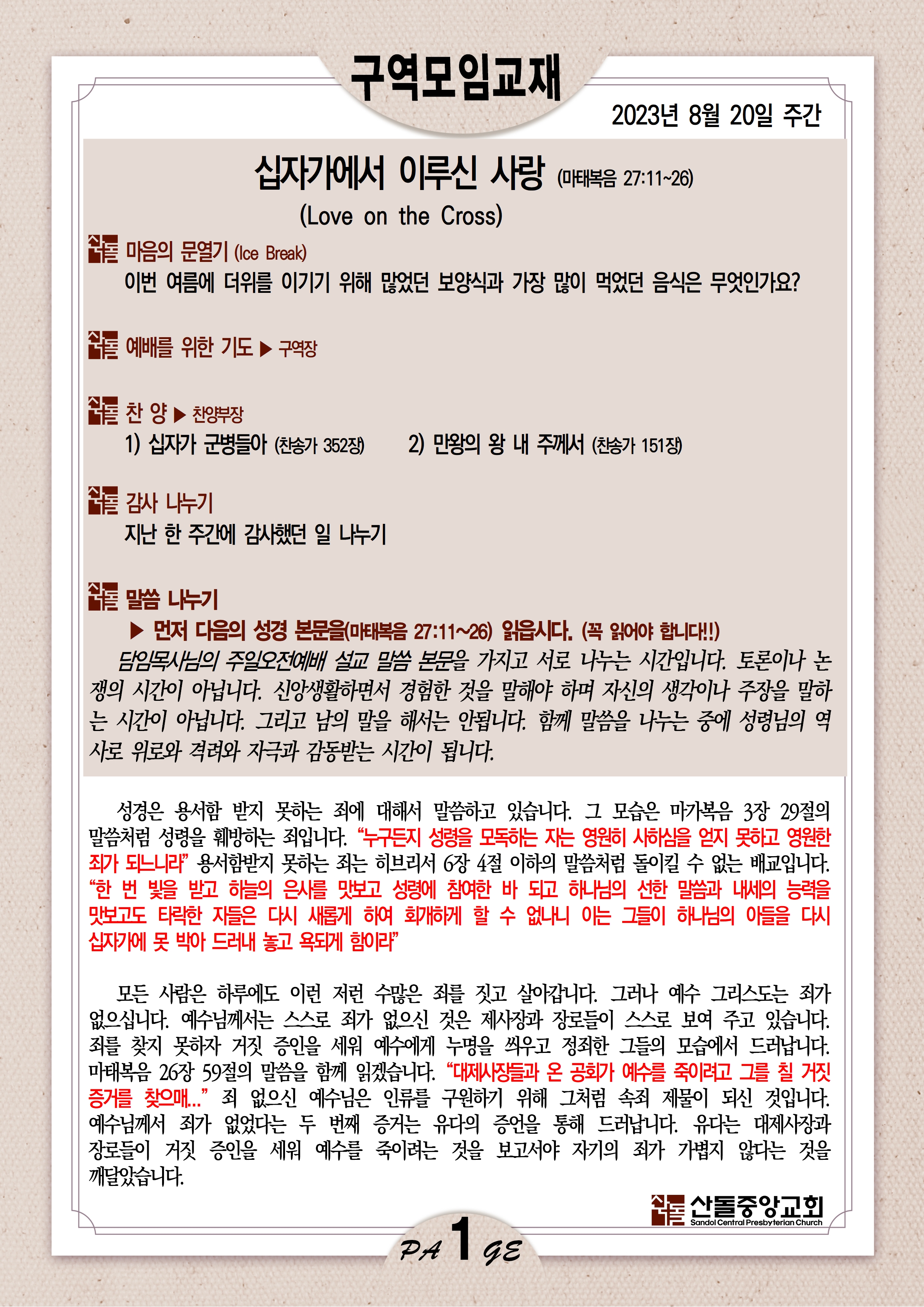 | 이전글 | 8월 27일 주간 구역모임교재 | 조창연 | 2023.08.27 | 0 | 410 |