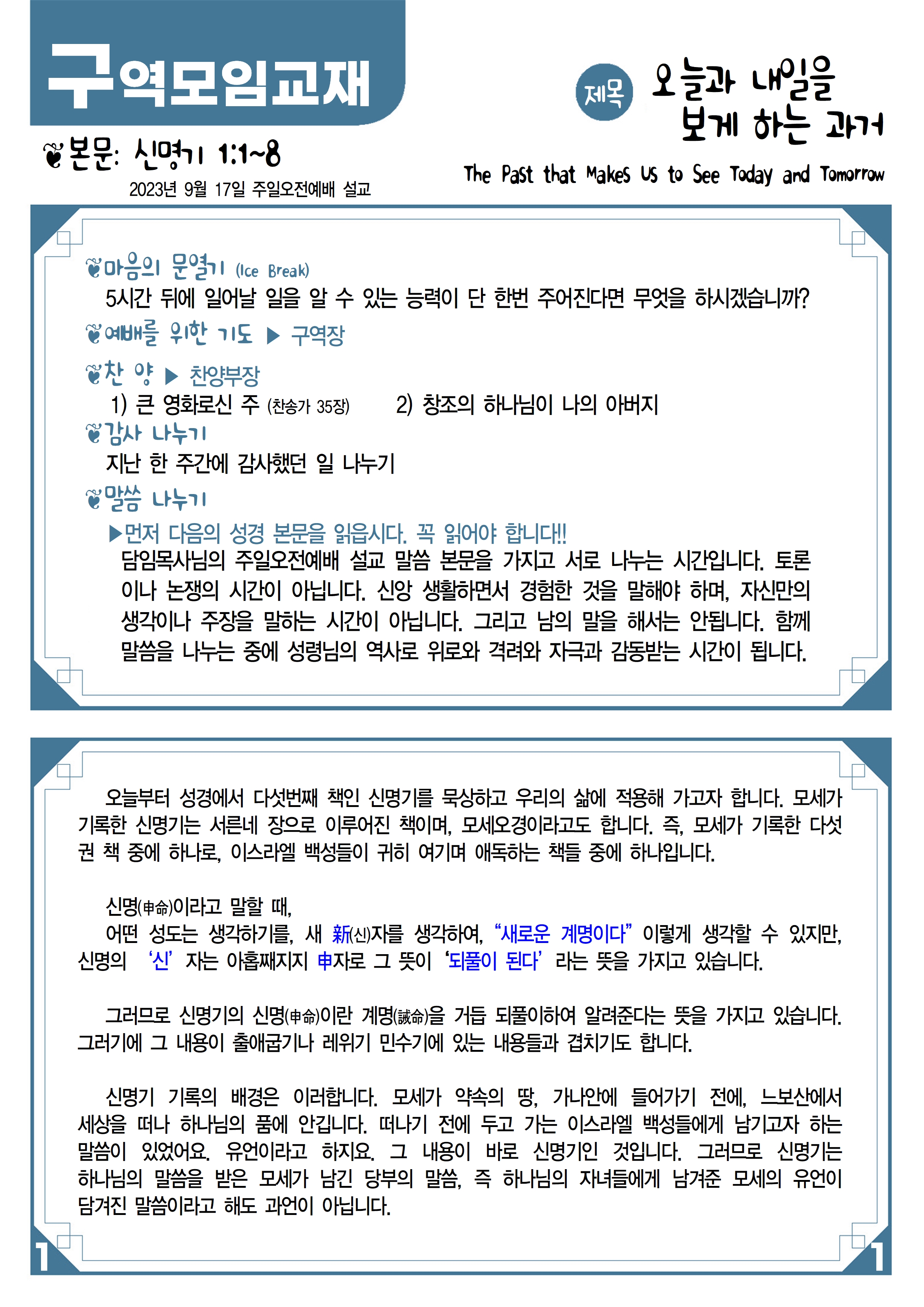 | 다음글 | 9월 10일 주간 구역모임교재 | 조창연 | 2023.09.08 | 0 | 403 |