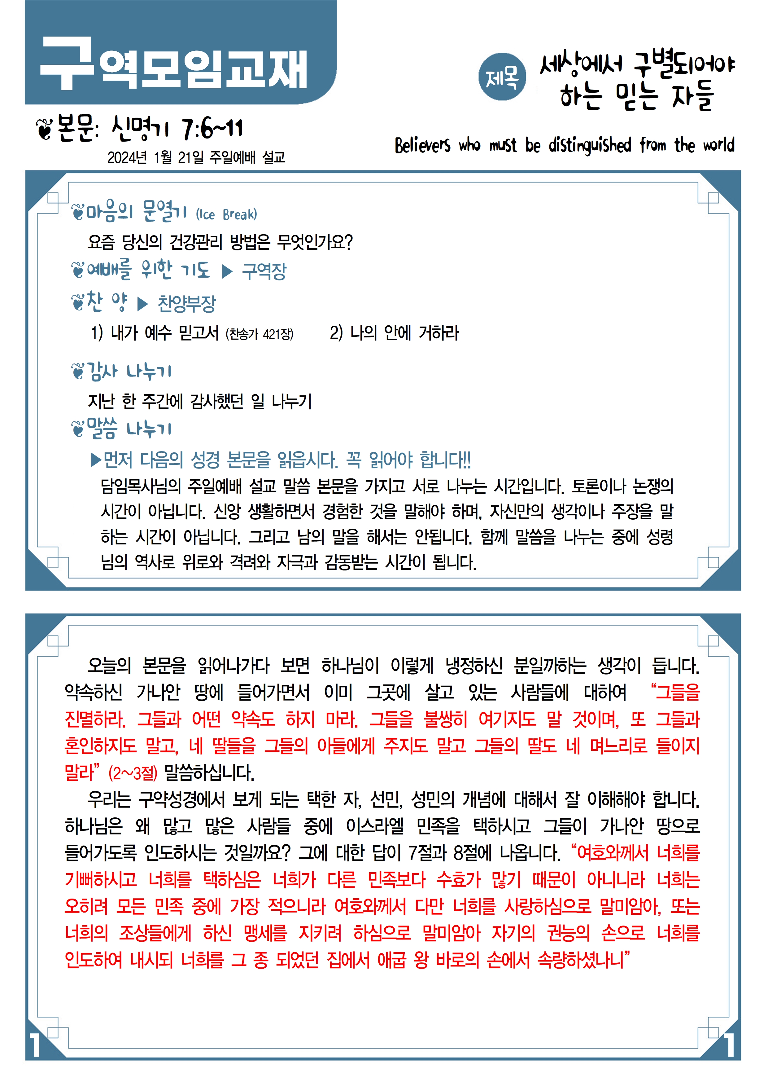 | 다음글 | 2024년 1월 14일 주간 구역모임교재 | 조홍유 | 2024.01.24 | 0 | 252 |