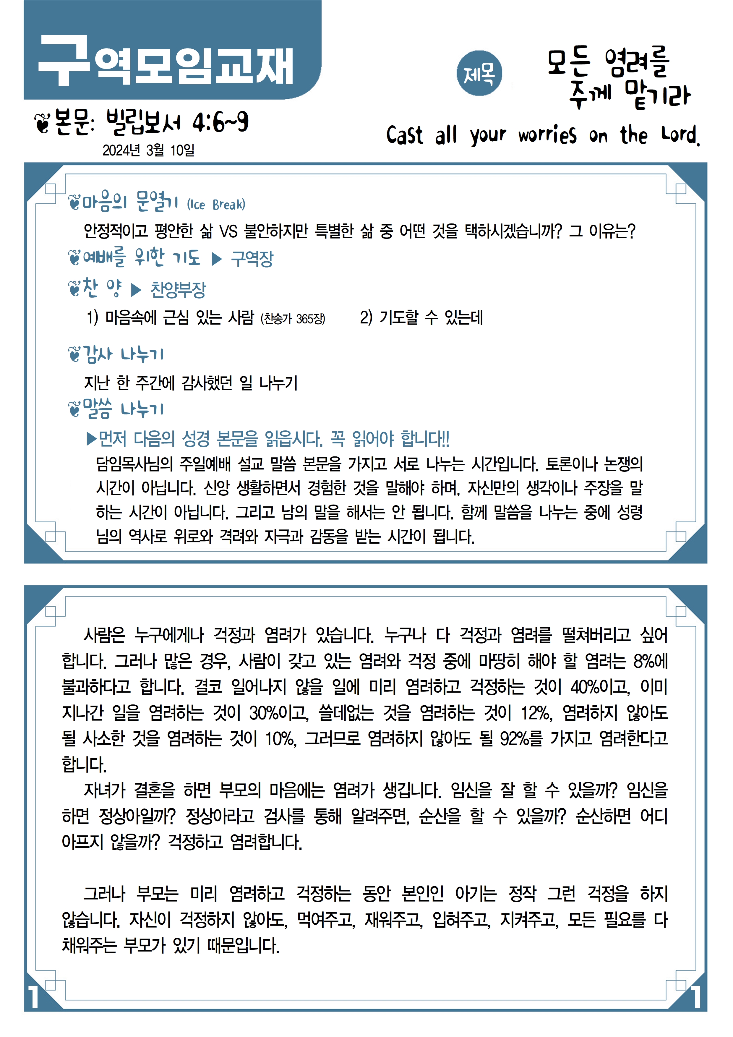 | 다음글 | 2024년 3월 3일 주간 구역모임교재 | 조홍유 | 2024.03.03 | 1 | 314 |